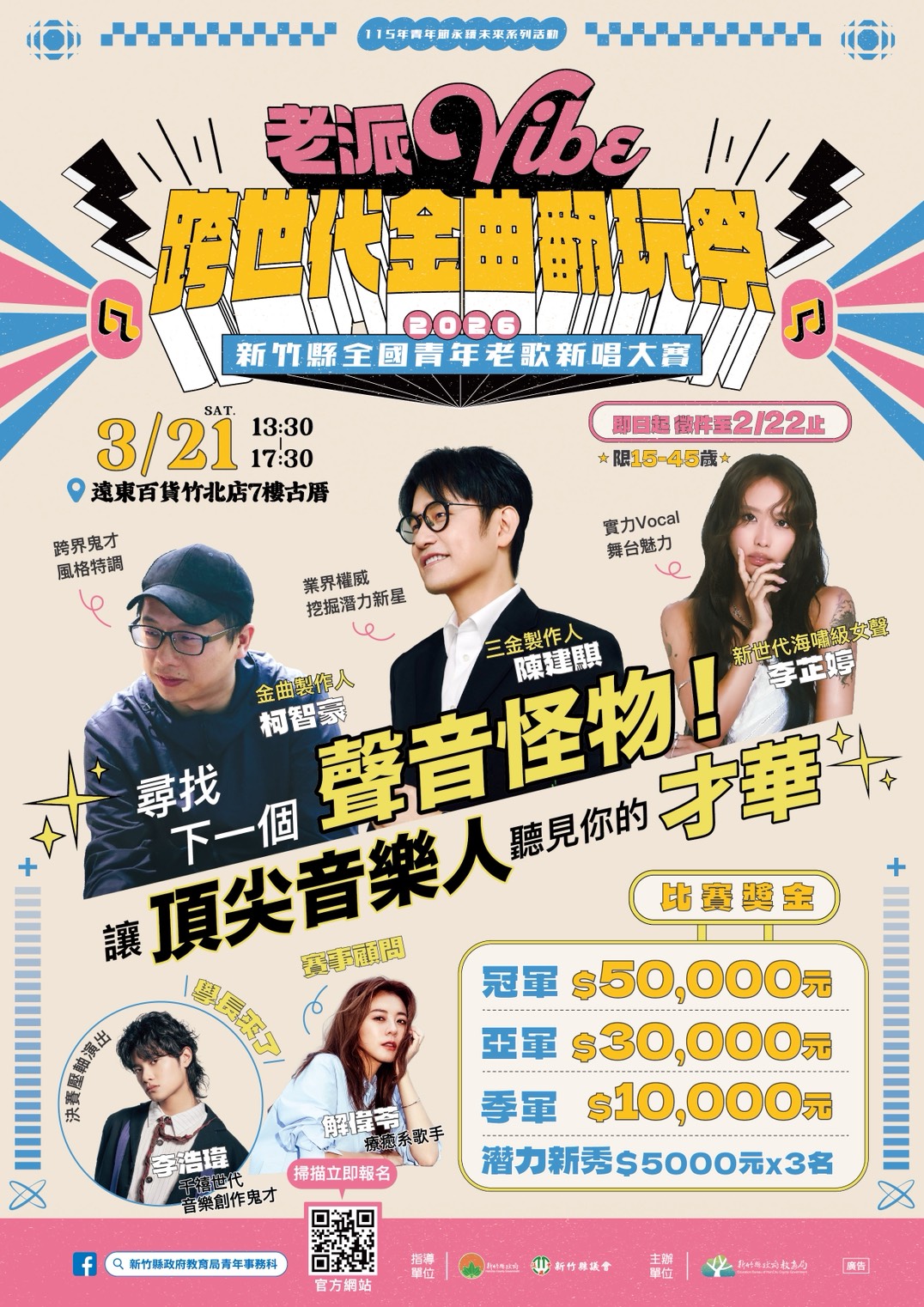 新竹縣最強音樂賽事「老派Vibe跨世代金曲翻玩祭」即日起開放報名,竹縣府教育局號召全國青年發揮創意,將一九七0至二000年間的經典流行樂曲重新編曲演繹,總獎金高達十萬元,決賽將於三月廿一日在竹北遠東百貨登場,縣長楊文科向青年喊話「舞台已經搭好,就等你來挑戰!」