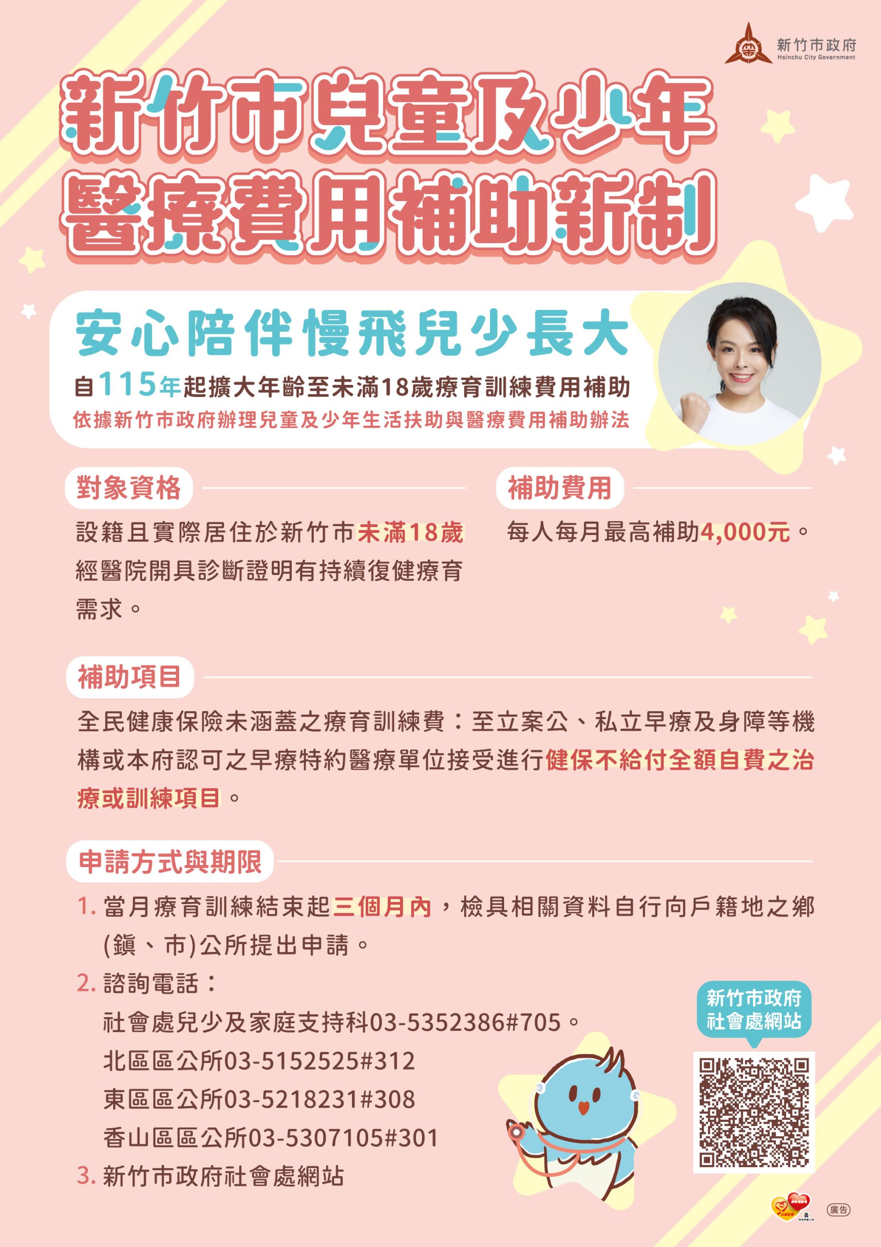 社會處長黃佳婷表示,新制調整兒童及少年生活扶助與醫療費用補助辦法訂定之年齡對象限制,將原本的補助六歲以下療育訓練及評估費,放寬年齡至未滿十八歲,協助有需求的弱勢兒少家庭,於六歲後可以持續接受療育訓練,舒緩醫療費用負擔,使更多的兒少及家庭可以受惠;而原有的未滿六歲或已滿六歲,未達到就學年齡發展遲緩兒童療育訓練費,仍可針對本補助或竹市早期療育費用補助實施計畫擇一提出申請,一起陪伴兒少度過黃金成長階段。