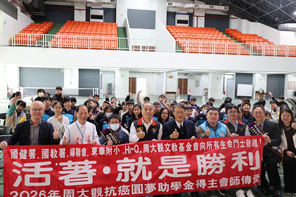 周大觀文教基金會為不讓所有罹癌學生獨對癌症,並鼓勵全國最弱勢的罹癌學生努力向學、忘記病痛,特別設置「抗癌圓夢助學金」,今(20)日周大觀基金會創辦人周進華聯袂花蓮縣長徐榛蔚、吉安鄉公所鄉長游淑貞、東華附小校長張慧娟等人,至花蓮市東華附小,一同為單親罕癌小地質學家陳柏旭加油打氣。
