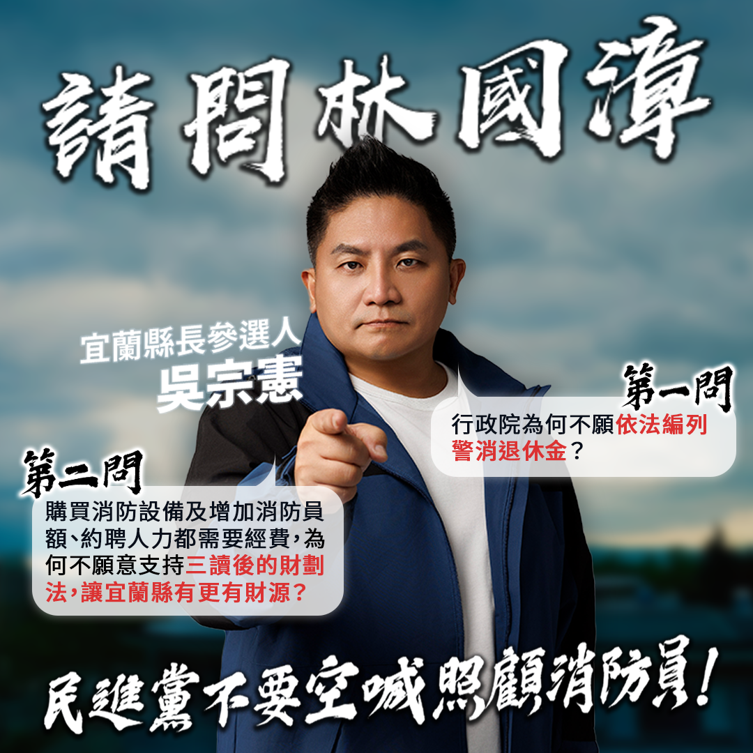 吳宗憲向行政院顧問林國漳提出二個問題,首先,警消退休金行政院為何不願依法編列?其次,無論是補蜂、抓蛇或是購買消防設備及增加消防員額、約聘人力都需要經費,為何不願意支持三讀後的財劃法,讓宜蘭縣政府更有財源來擴充警消設備,以確保執勤時安全?期盼林國漳顧問能發揮關鍵力量,不再讓「有事才找警消」這心酸話繼續出現,我們一同讓宜蘭縣警消工作環境及待遇更好。