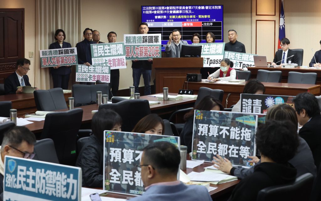 立法院程序委員會二十日開會討論二十三、二十七日院會議程,民眾黨團建議依照議程草案處理,儘管民進黨團反對,但藍、白擁有人數優勢,將議程草案提報院會處理。由於行政院不願意依法編列三讀通過的軍人加薪等相關預算,包括今年度中央政府總預算案和一點二五兆的國防特別條例等案至今依舊卡關,無法進入實質審查。