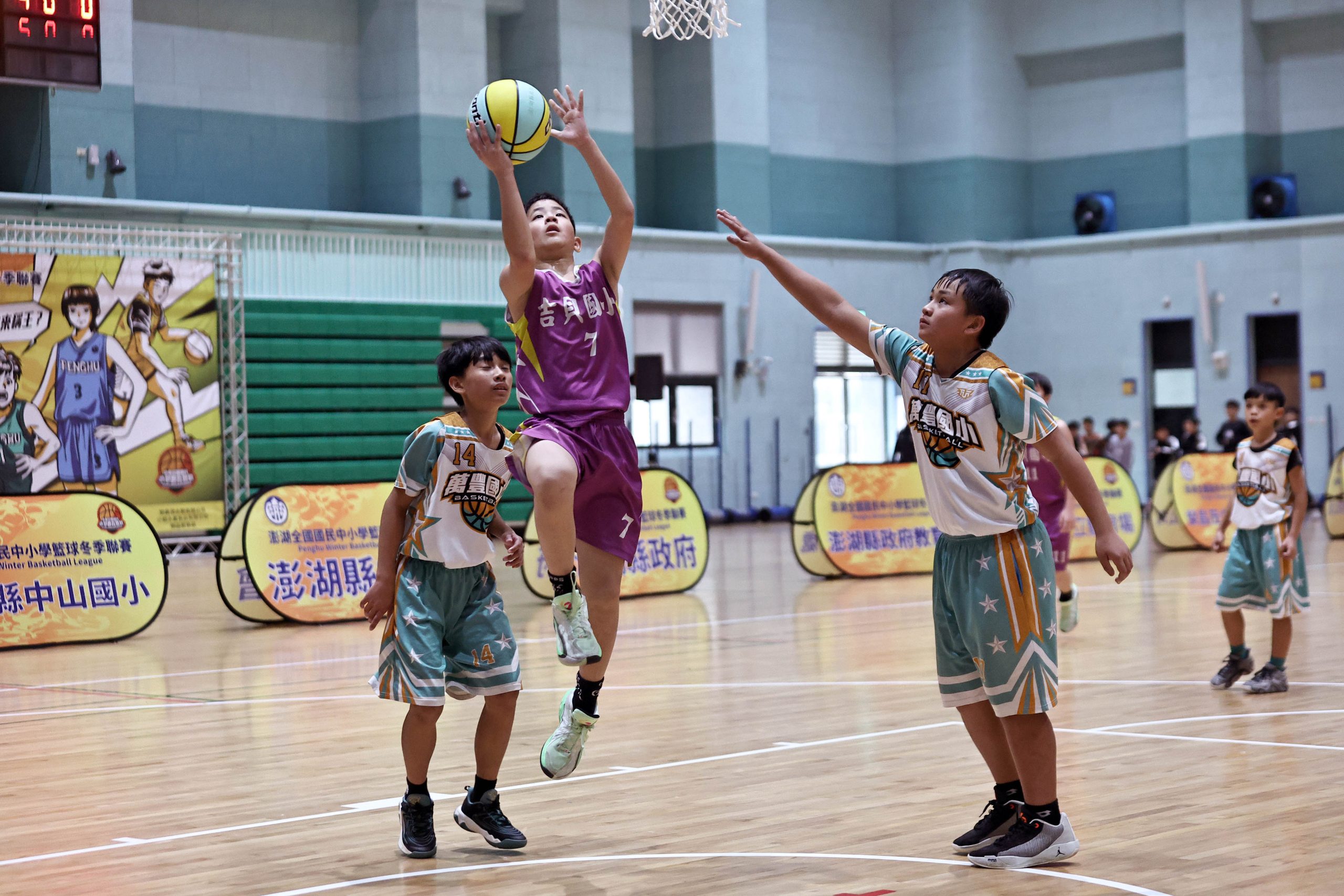 澎湖吉貝國小魯祐成切入上籃。(澎湖縣政府提供)