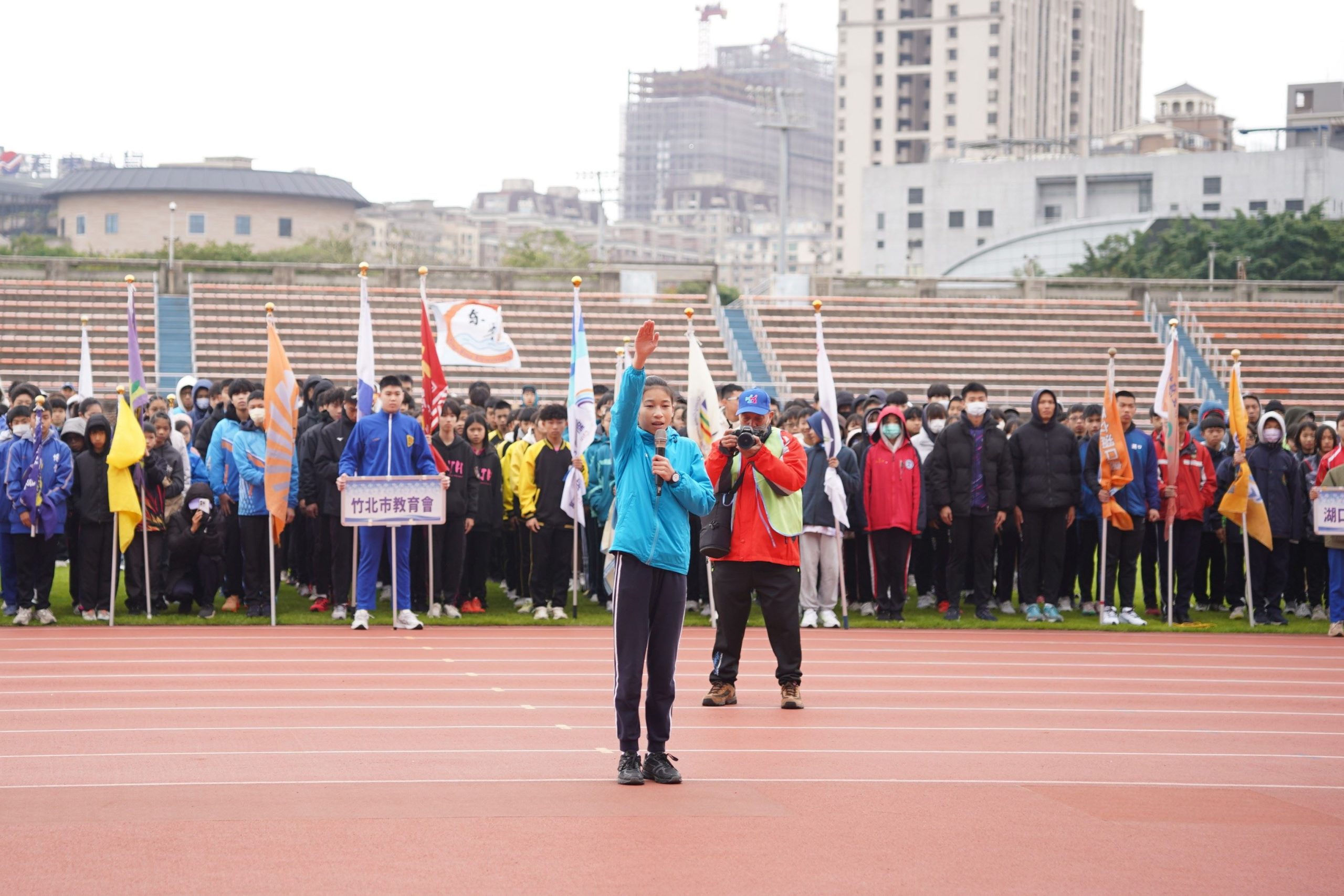 新竹縣一一五年全縣中小學聯合運動大會廿一日於新竹縣立體育場舉行開幕典禮,新竹縣副縣長陳見賢與工作人員於竹北天后宮完成祈福儀式、點燃聖火後,各校代表隊於新竹縣體育場集結進場,正式揭開為期四天的田徑賽事序幕。