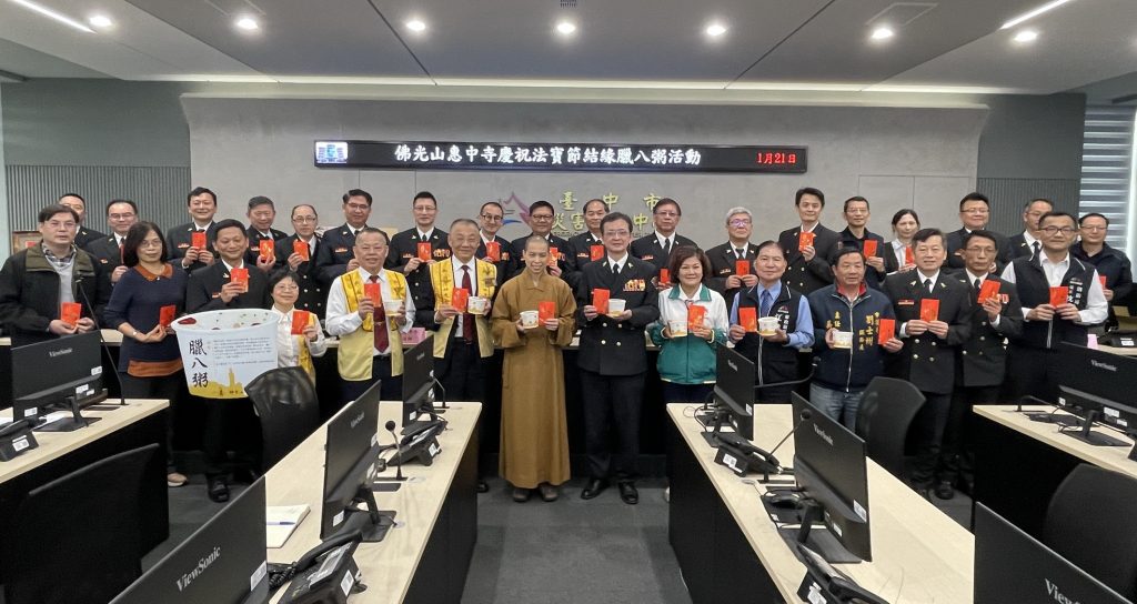 農曆十二月初八為佛陀成道日,佛光山惠中寺副住持如瑄法師二十一日前往台中市消防局舉辦贈粥儀式,致贈消防人員臘八粥,並致送星雲大師墨寶春聯「和諧共生、馬到成功」。由消防局副局長楊元吉代表受贈,並回贈感謝狀及紀念品,雙方在溫馨莊嚴的氛圍中互道祝福與感謝。