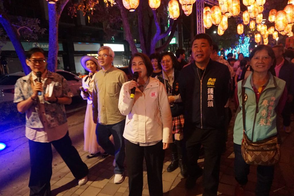 屏東燈節位於內埔鄉的客家燈區將於一月二十三日開展,縣長周春米(中)及鄉長鍾慶鎮提前於二十一日晚間點燈,是全國最早點燈的燈區。(記者鄭伯勝攝)