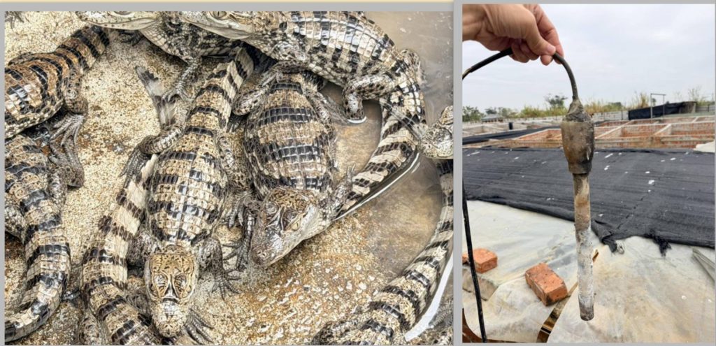 氣溫急降!鱷魚對低溫敏感,活動力明顯降低(左),業者啟動防寒機制,電熱棒24小時加溫不斷電(右)。(記者湯朝村攝)