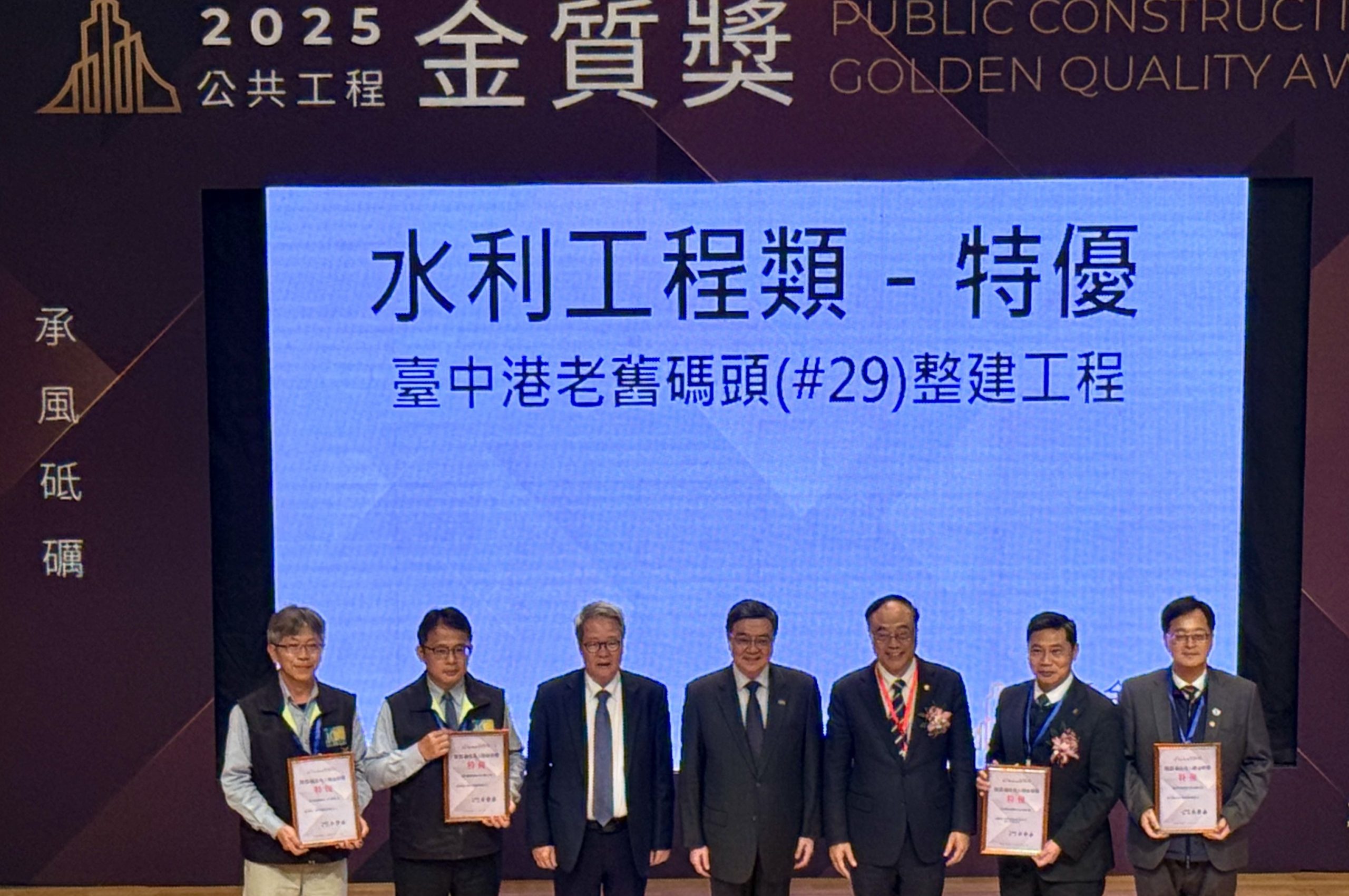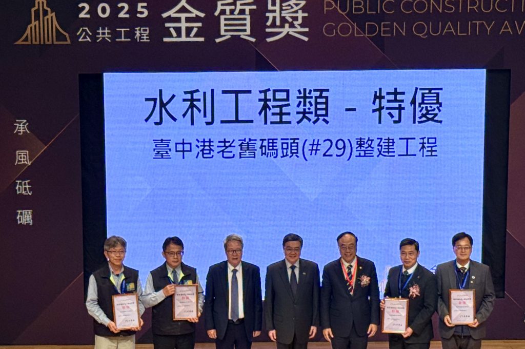 第廿五屆公共工程「金質獎」揭曉,臺灣港務公司再創佳績,以「臺中港老舊碼頭(#29)整建工程」榮獲特優獎,「花蓮港#17~#25碼頭震災修復工程」榮獲優等獎,再度獲得工程界奧斯卡獎肯定,以綠色工法與韌性港埠打造永續港灣新典範。
