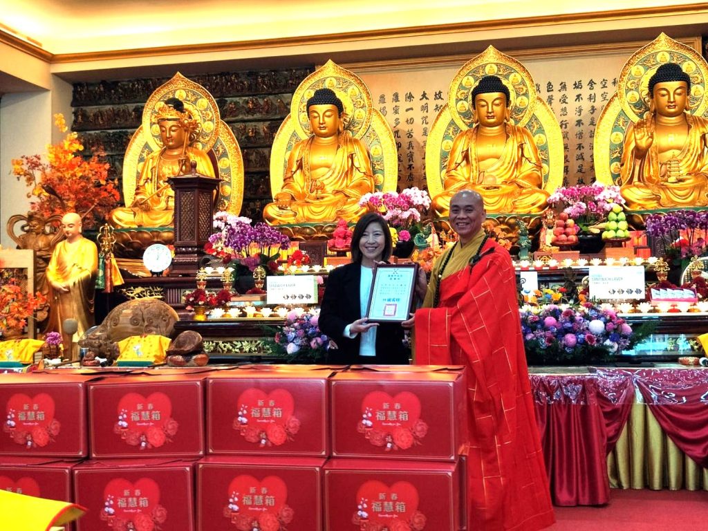 為使弱勢家戶安心迎接春節,元亨寺台北講堂二十一日捐贈五百份「福慧箱」予基隆市,協助弱勢家庭度過溫馨好年。社會處副處長盛慧中代表回贈感謝狀。