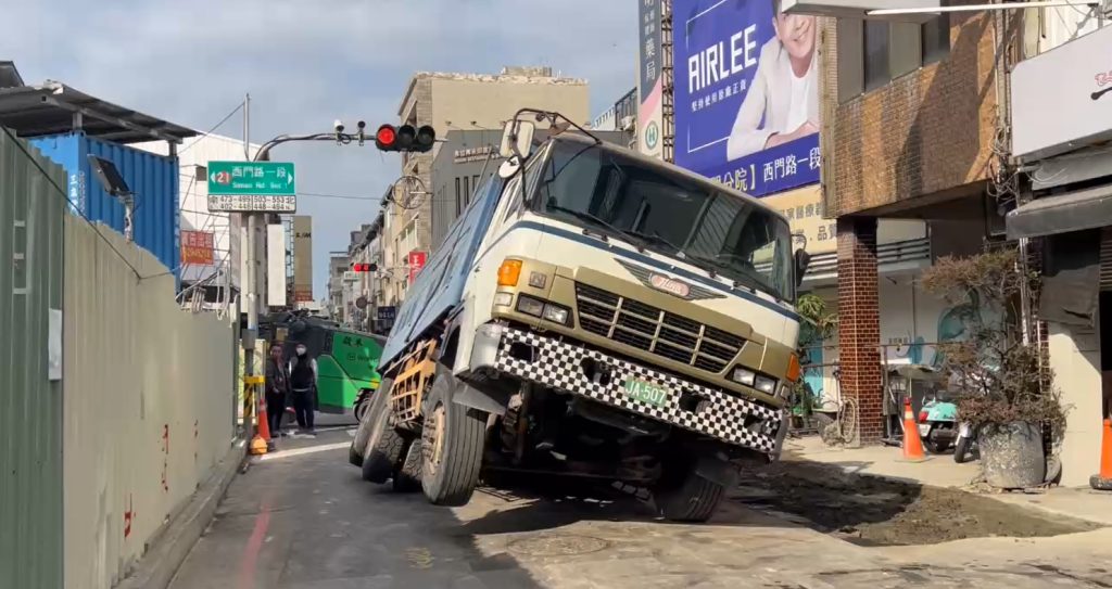 中西區五妃街二十日下午出現道路下陷(天坑),經工務局緊急搶修,豈料二十一日上午又再度出現坍塌事故,在甫鋪好柏油路旁直接「破大洞」,一輛大貨車後輪當場被「吞掉」,工務局除緊急回填,市府也啟動跨局處小組,成立前進指揮所,全力維護周邊民宅安全並對周邊營造廠開罰。