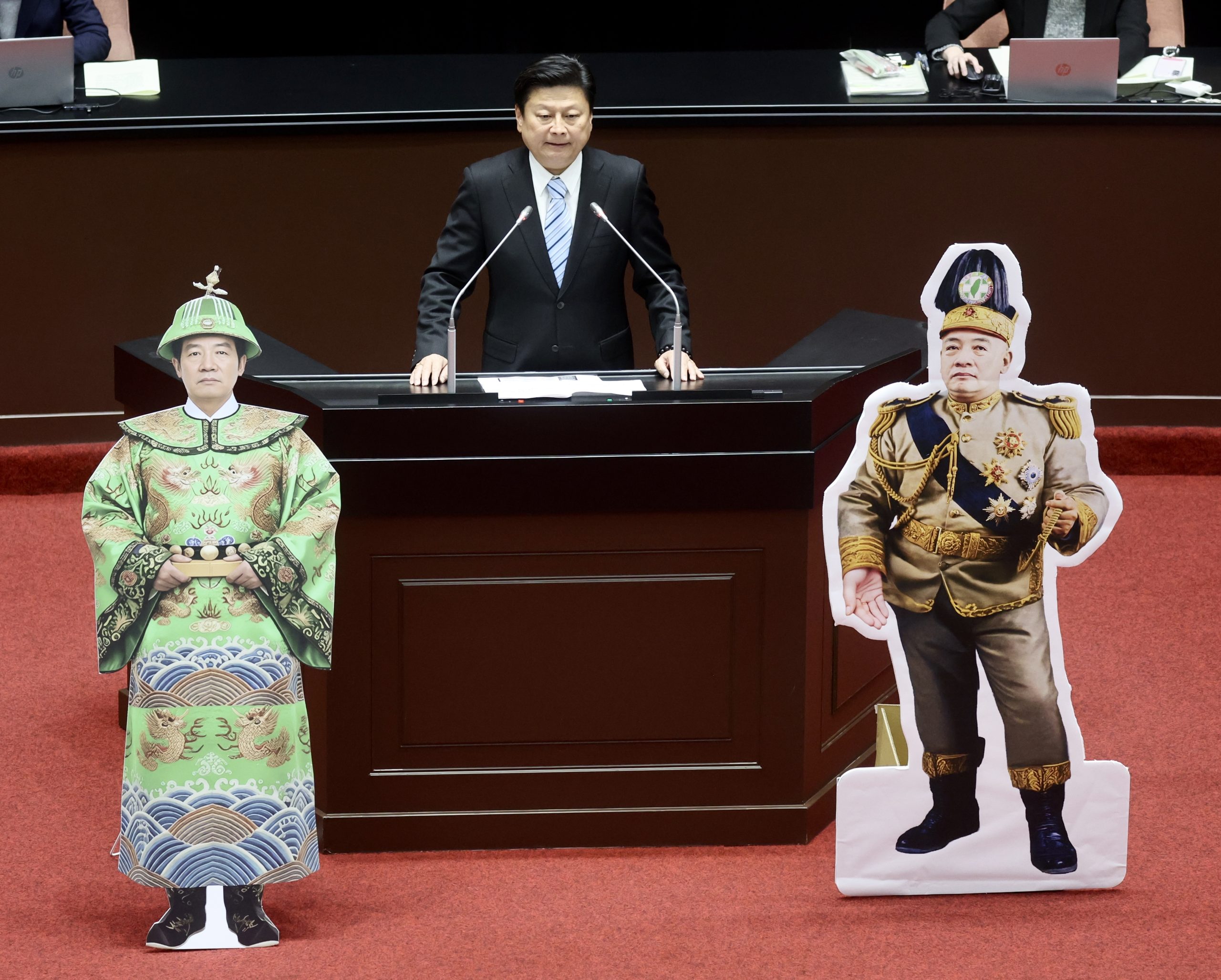 立法院二十一日進行總統賴清德彈劾案首場審查會,雖然被彈劾的賴總統缺席未到,但在野立委準備「賴皇帝」人形立牌備詢,朝野言詞交鋒不斷,藍、白立委指控賴總統藐視國會、逃避憲法責任,民進黨立委反批彈劾程序欠缺正當性,強調總統與立法院並無從屬關係。