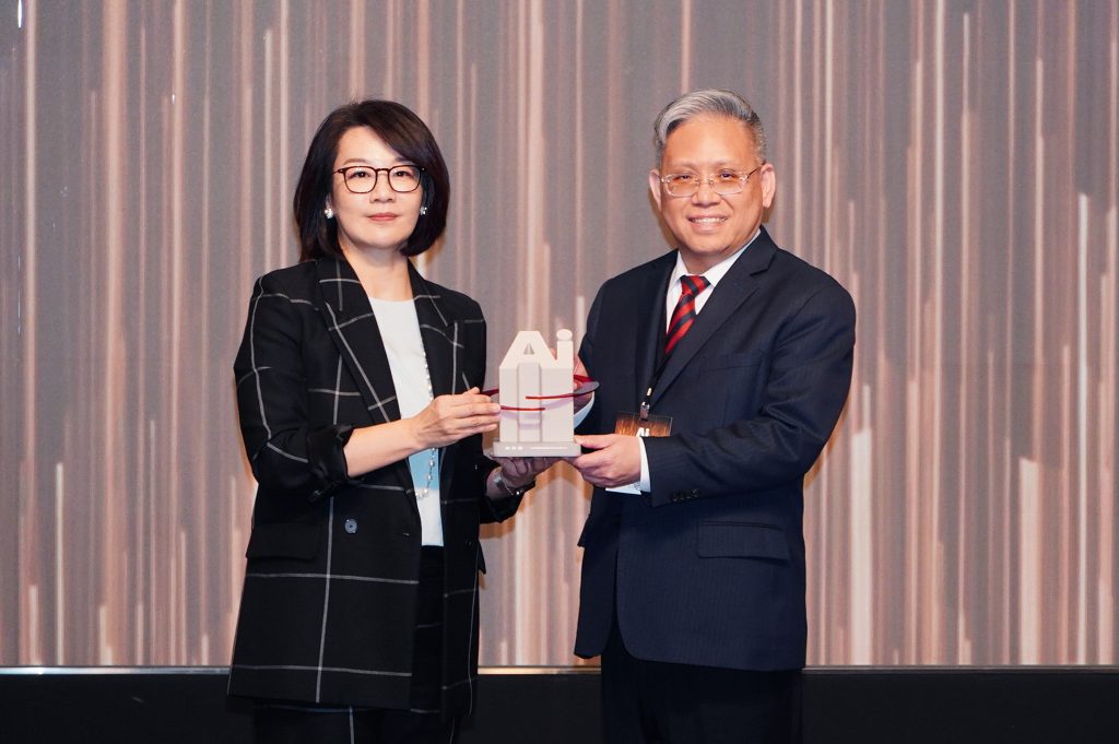 台新銀行榮獲《商周AI創新百強》金融保險業銀質獎,由商周集團執行長郭奕伶(左)頒獎,台新銀行科技長李正國(右)代表領獎。