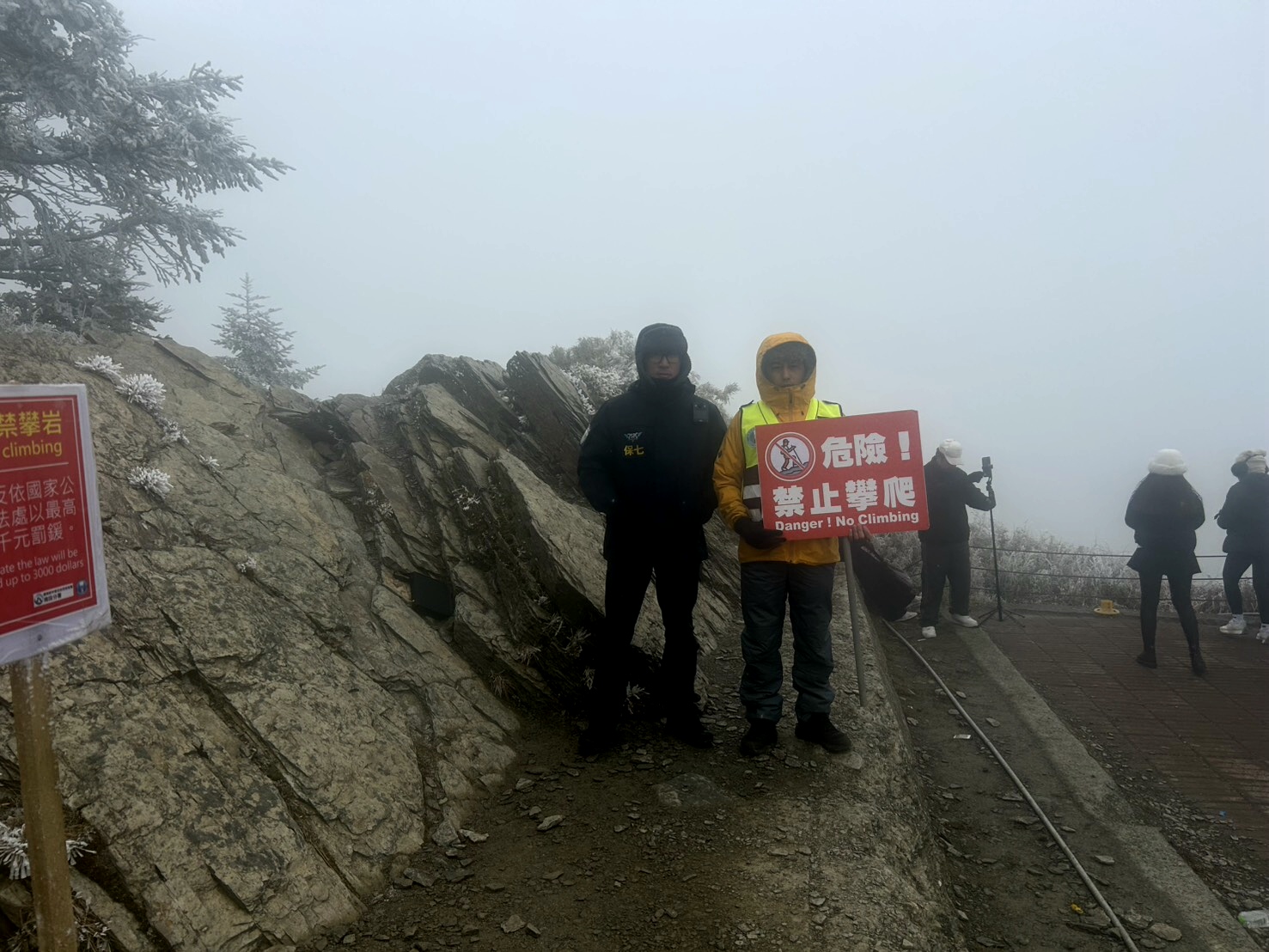 因為公路旁已無積雪,武嶺停車場岩壁的雪景,成為民眾拍照熱區,為了拍到美照,民眾攀爬至武嶺岩壁,跟岩壁上的森林積雪合照,此一行為除了危險外,還違反國家公園法第十三條太魯閣國家公園公告禁止事項之相關規定。