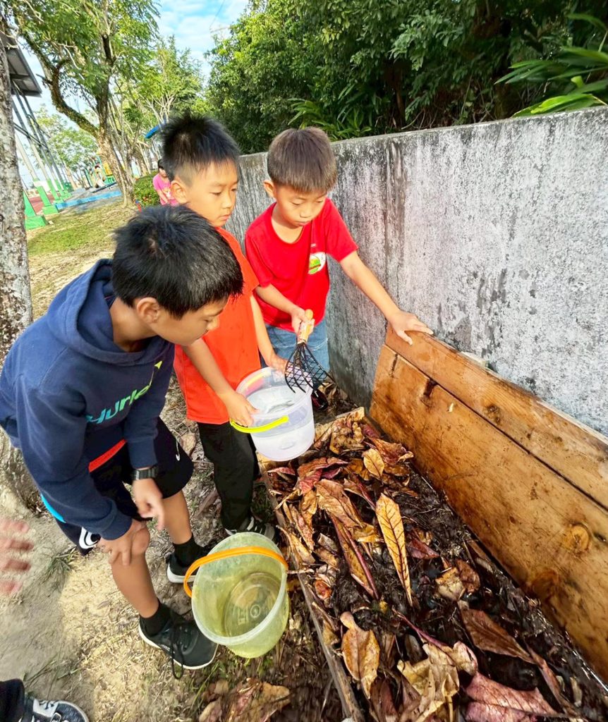 新山國小的小朋友,將收集來的落葉澆水和翻堆,將落葉再利用轉化為腐植土。(新山國小提供)