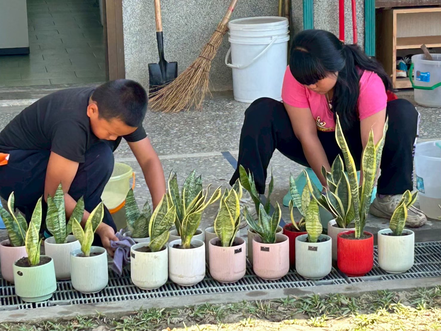 新山國小的學生,利用腐植土栽種美麗的虎尾蘭盆栽。(新山國小提供)