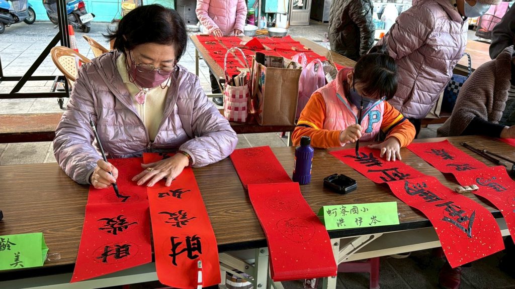 現場除了樂齡學習中心書法班和蚵寮國小學生現場揮毫外,更設置「民眾自寫區」,由鄉親自己體驗寫春聯。這次活動最大的亮點在於樂齡學員宮美秀與蚵寮國小學生洪伊岑這對「祖孫檔」同台揮毫,展現了代間共學的溫馨與文化傳承,索取春聯的民眾非常踴躍。