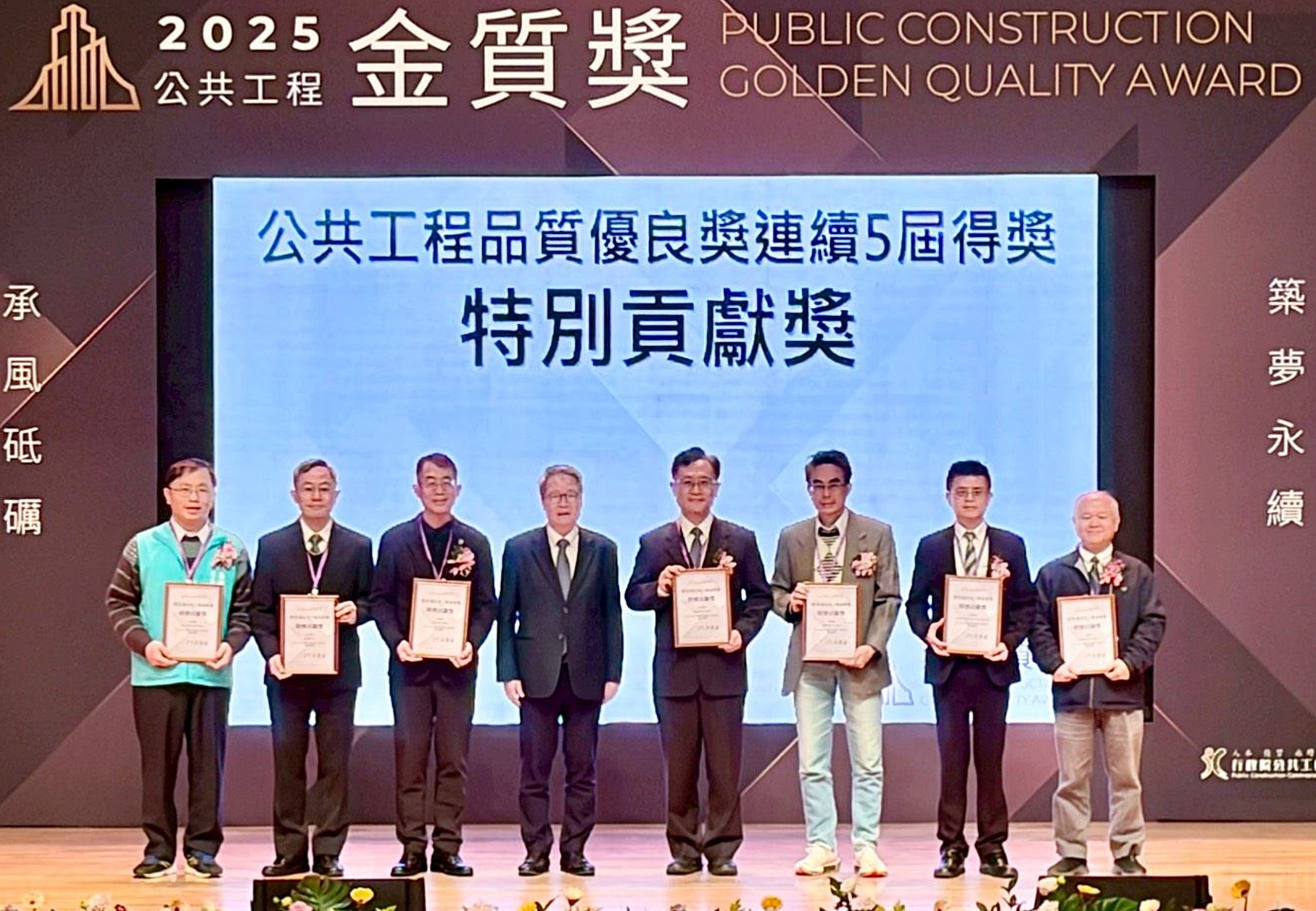 台中港務分公司秉持「安全、品質、永續」的工程核心理念再創佳績,「台中港二十九號老舊碼頭整建工程」以綠色工法與韌性港埠打造永續港灣新典範獲水利類特優,由總經理林春福代表領獎。