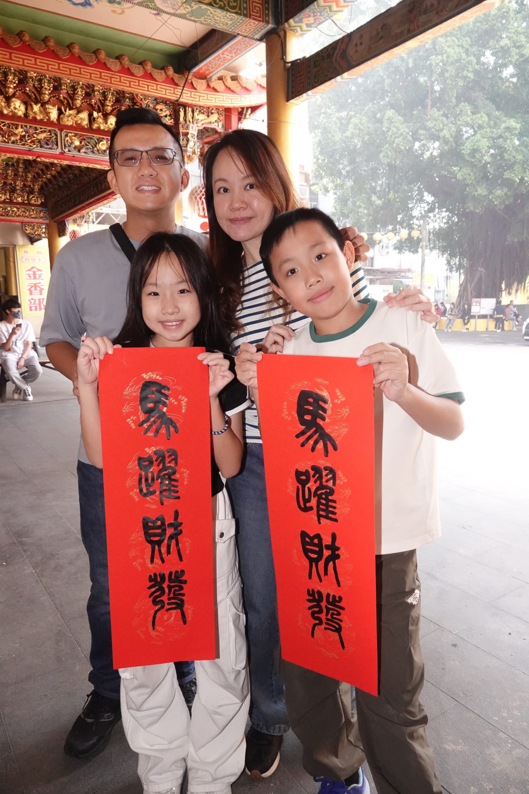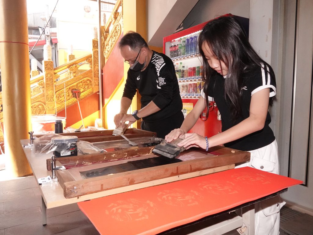 開基玉皇宮每年舉辦親子絹印春聯活動,吸引大小朋友DIY自己專屬的春聯。          (記者陳俊文攝)