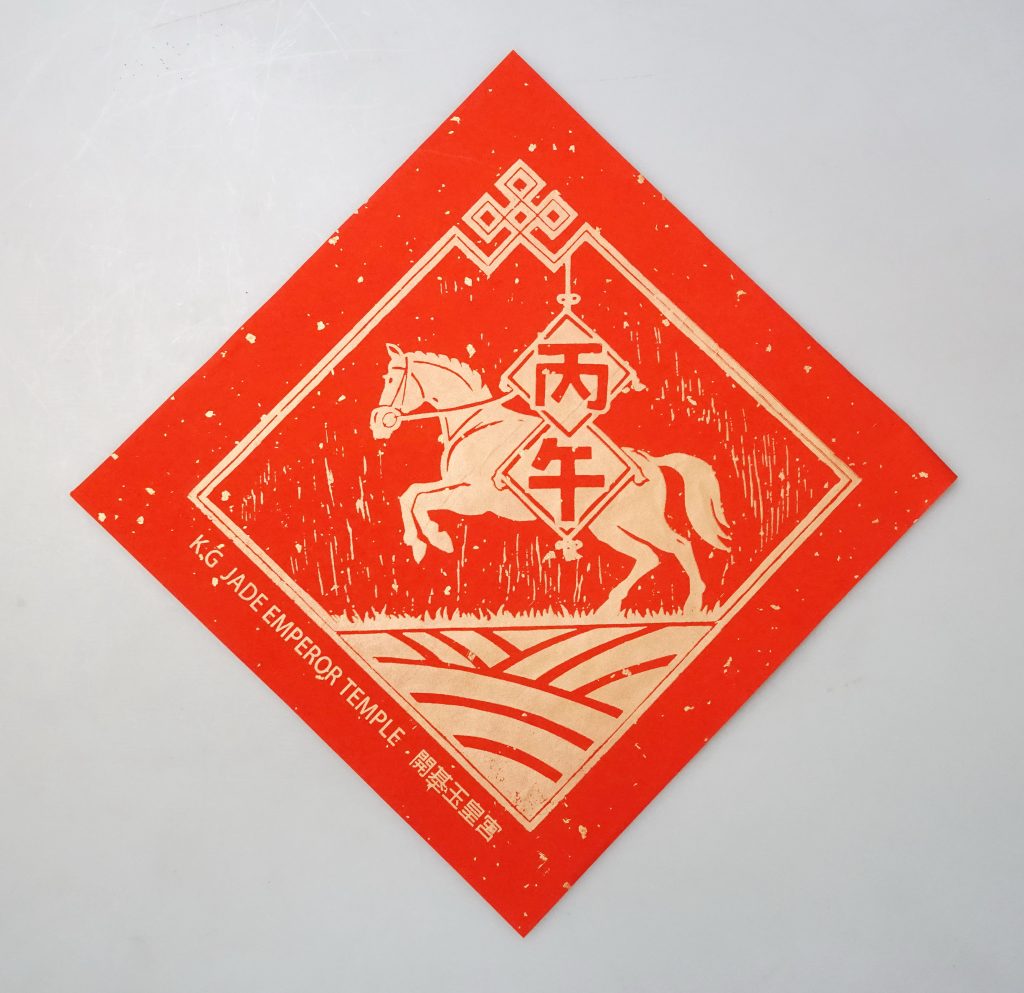 開基玉皇宮每年春節前都舉辦兩場應景的贈春聯,已從上週末登場的春聯絹印,大四方春聯的底圖來自台南悠頭畫會前理事長黃鈿凱和台南海事學校林訓丞老師的畫作,明年是丙午馬年,這些畫作都和「馬」年生肖有關,還有幫小朋友準備Q版絹印,吸引親子前來印製自己的春聯回家張貼。