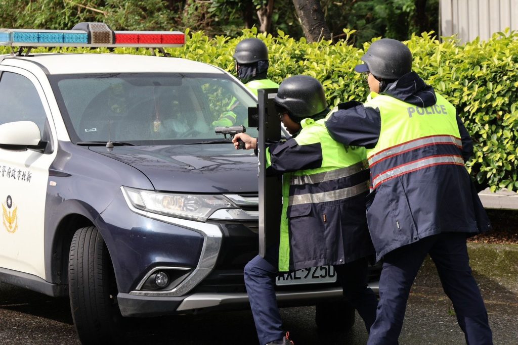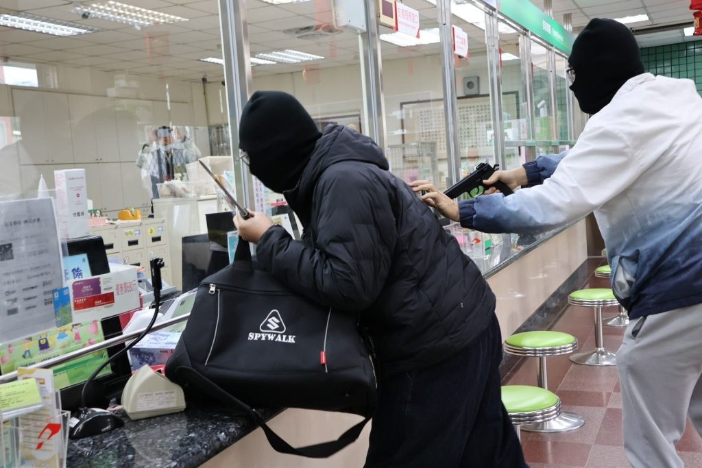 演練情境模擬兩名歹徒共乘機車,蒙面持槍闖入三芝郵局,威嚇行員交出櫃檯內大筆現金。郵局行員機警應對,一方面採取拖延戰術,另一方面趁隙按下隱藏報案鈴。淡水分局勤務指揮中心獲報後,立即派遣線上警力馳赴現場,並根據行員提供的歹徒特徵與逃逸方向,迅速通報轄區各派出所啟動「攔截圍捕」機制。