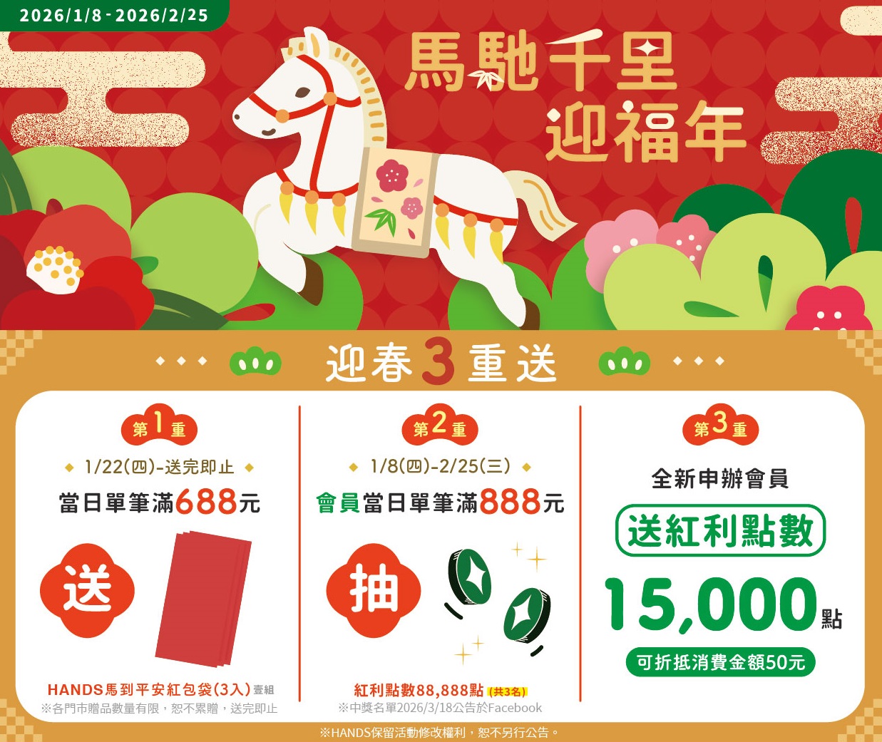 台隆手創館即日起春節活動檔期開跑,〈馬馳千里.迎福年〉購物滿688元,即贈HANDS獨家福馬迎好年紅包袋三入組,會員獨享單筆滿888元,即可參加紅利點數88,888點好運抽獎活動。台灣過年必買的年節伴手禮,春節返鄉帶給二老的樂齡健康禮物,還有同步日本的傳統開運招財擺件,春節應景採購來HANDS,好運馬上來!