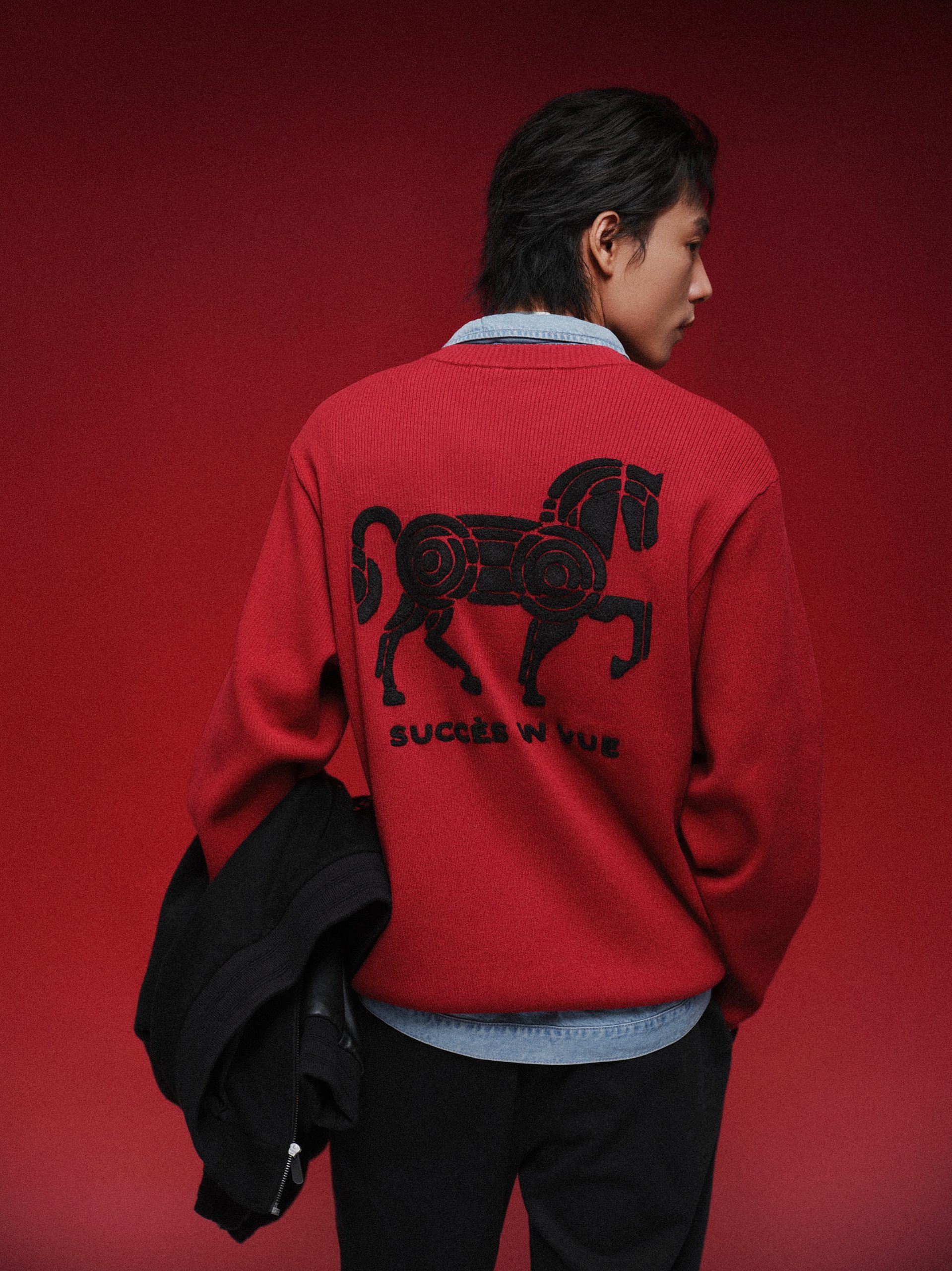 本季主打的馬年限定圖騰彩繡開襟針織衫,巧妙運用紅、白、棕三色織條設計,勾勒出層次分明的復古質感,材質特別選用含棉羊毛成分的混紡紗線,兼具冬季所需的保暖性與親膚觸感讓幸福感瞬間提升,落肩版型不僅能巧妙修飾身型,搭配精緻的馬年彩繡圖騰,在走春拜年時輕鬆穿出從容又甜美的都會休閒感。