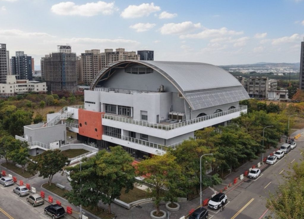 陳大田說,運動館建築外觀以圓弧屋頂搭配方形外懸廊設計,整體造型宛如一顆暖橘色夕陽,並以局部亮橘色點綴,展現活潑且富有生命力的意象;此外,場館外圍規劃環狀熱身步道,民眾於暖身行走時可遠眺周邊景觀,串聯在地風貌,達到身心放鬆效果。另運動館建築採高標準規劃設計,目標取得綠建築「黃金級」及智慧建築「合格級」標章。
