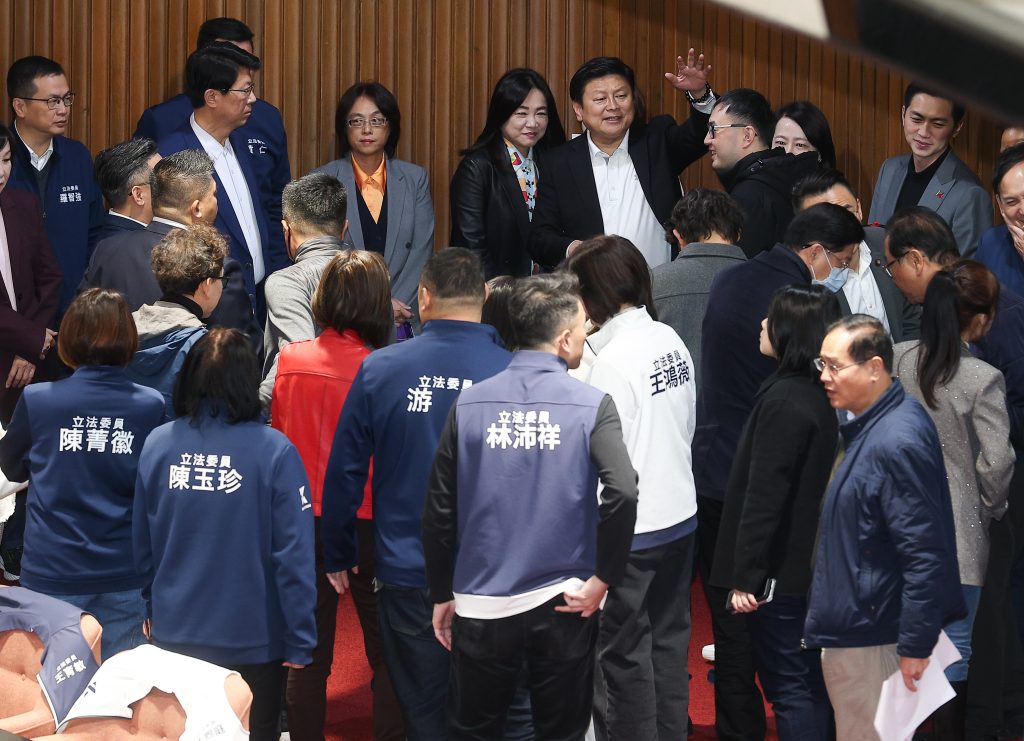 藍白立委挾人數優勢,決議建請賴總統履行承諾,至立法院就國家安全、兩岸情勢、對美軍購與國防預算規劃進行國情報告,並接受立委諮詢。過程中,國民黨團總召傅崐萁與藍委在議場聚集討論。(中央社)