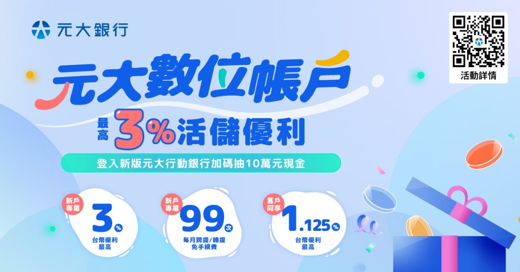 元大銀行數位帳戶新戶最高享3%臺幣活儲優利、月月登入再抽10萬元大獎!(元大銀行提供)