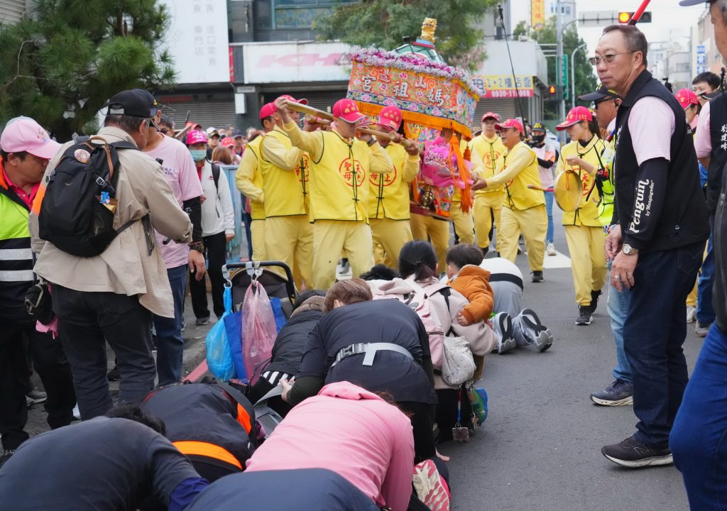 山邊媽祖鑾轎行經所到之處,沿途大批信眾虔誠跪拜躦轎底。(記者陳金龍攝)