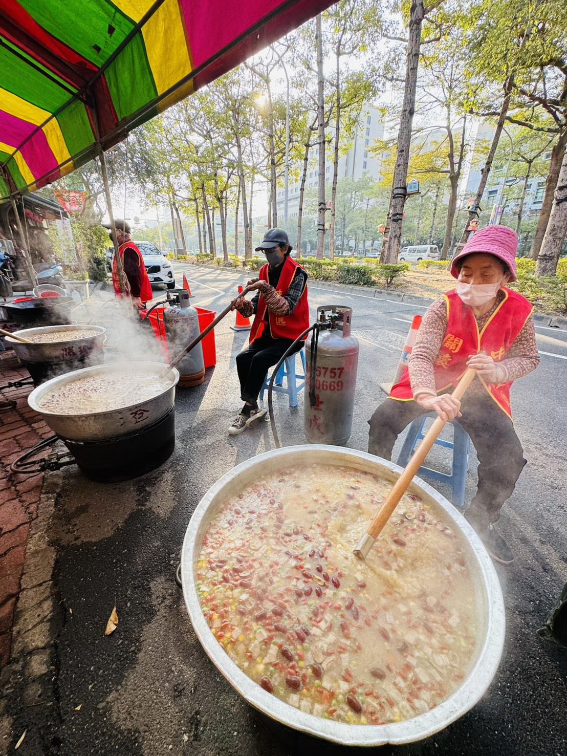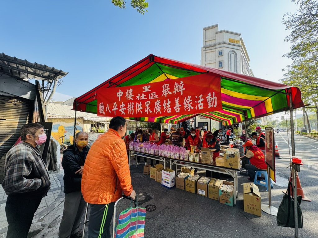中樓里每年供應臘八粥,都由他貼出公告邀請里民共襄盛舉,大家開始捐錢,一下子就額滿。今年共準備兩千碗,總經費四萬元,都來自四方里民的捐獻。志工經為期三天的備料,準備香菇、素火腿、青豆、蓮子、花生、玉米、木耳、紅棗、枸杞、青江菜、蒜泥等多種食材熬粥,除分享里民,附近的公家機關都可享受到此一「好康」。