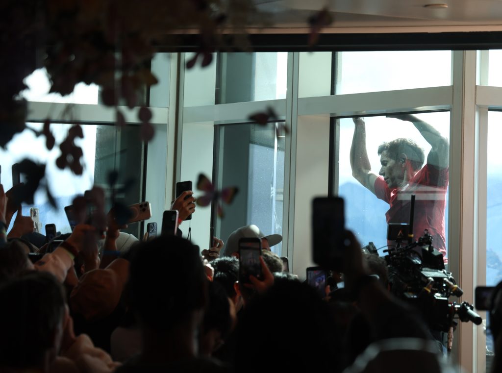 地面聚集上千人見證,八十九樓觀景台也有百名粉絲買票進場,熱情喊「Go!Alex!」為他加油。上午九點三十分,超過五十名粉絲在售票口等候,想近距離觀賞霍諾德的攀登過程,但最佳攝影位置被Netflix工作團隊占據,粉絲只能在紅龍外觀賞。