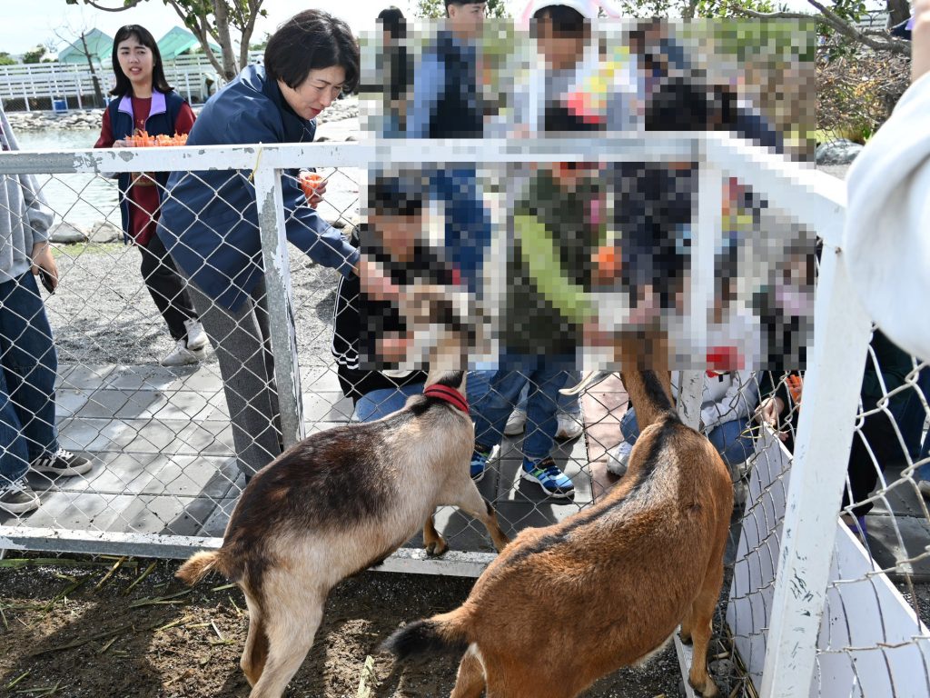圖:饒慶鈴化身「縣長媽咪」和監護兒少一起餵食羊駝等動物,孩子們臉上洋溢驚喜與歡笑。(台東縣府提供)