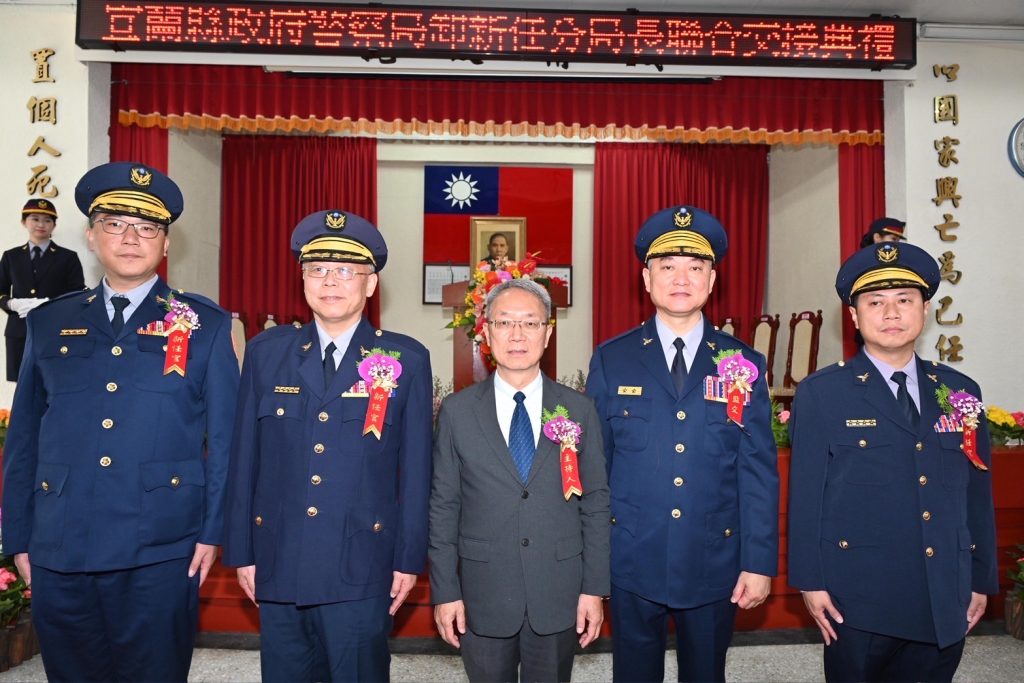 宜蘭縣警局舉行卸、新任分局長聯合交接:左1羅東分局長宋俊良、左2主任秘書楊宗昆、右1三星分局長陳育健。(宜蘭縣警局提供)