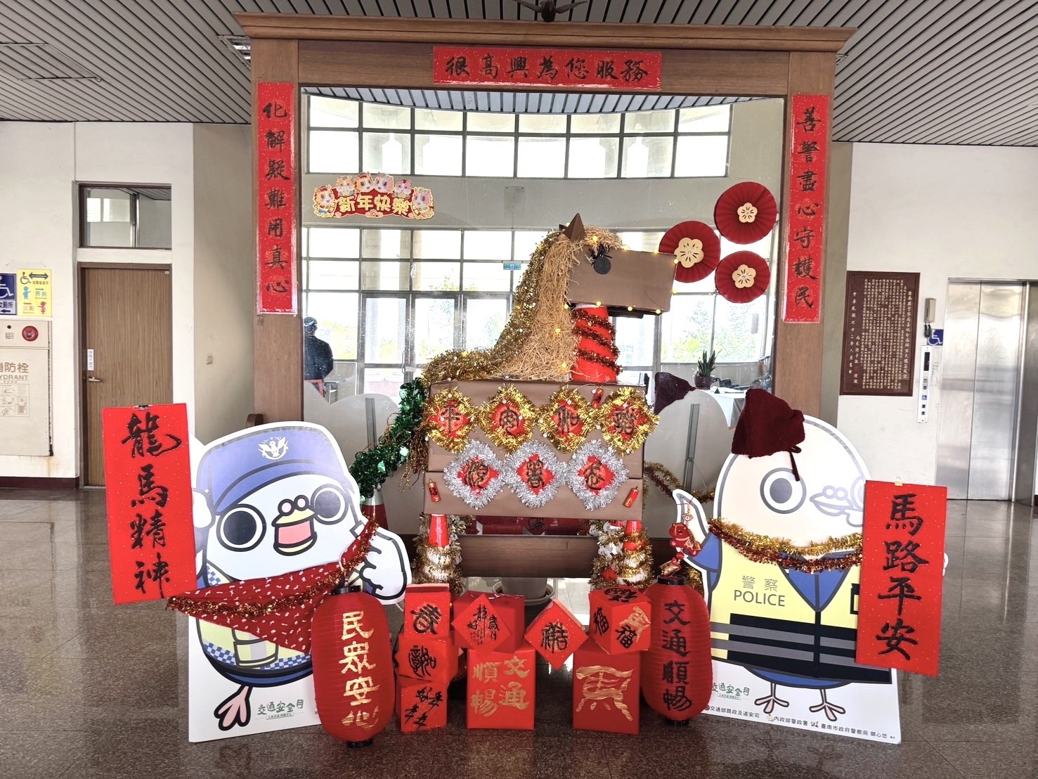 迎接馬年到來,善化警分局運用AI科技,結合在地警政元素與交通特色,在分局入口處裝置「馬年主題燈」,將平時執勤交通錐融入創作,搭配大紅燈籠增添過年喜氣,讓洽公民眾感受濃濃過年氛氛。