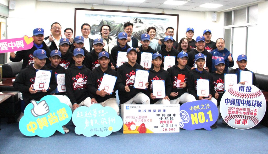 南投縣立中興國中棒球隊參加二0二六台南市巨人盃國際青少棒錦標賽,在四十八支國內外勁旅中,不僅勇奪隊史首座巨人盃冠軍獎盃,還榮獲大會MVP、最佳投手獎與打擊獎第一、二名等個人獎項。縣長許淑華二十六日特別頒發獎狀及營養金,並宣布縣府將自籌九千萬元加速推動縣立棒球場二期工程,讓球隊有更安全完善的訓練與比賽場地,再創高峰。