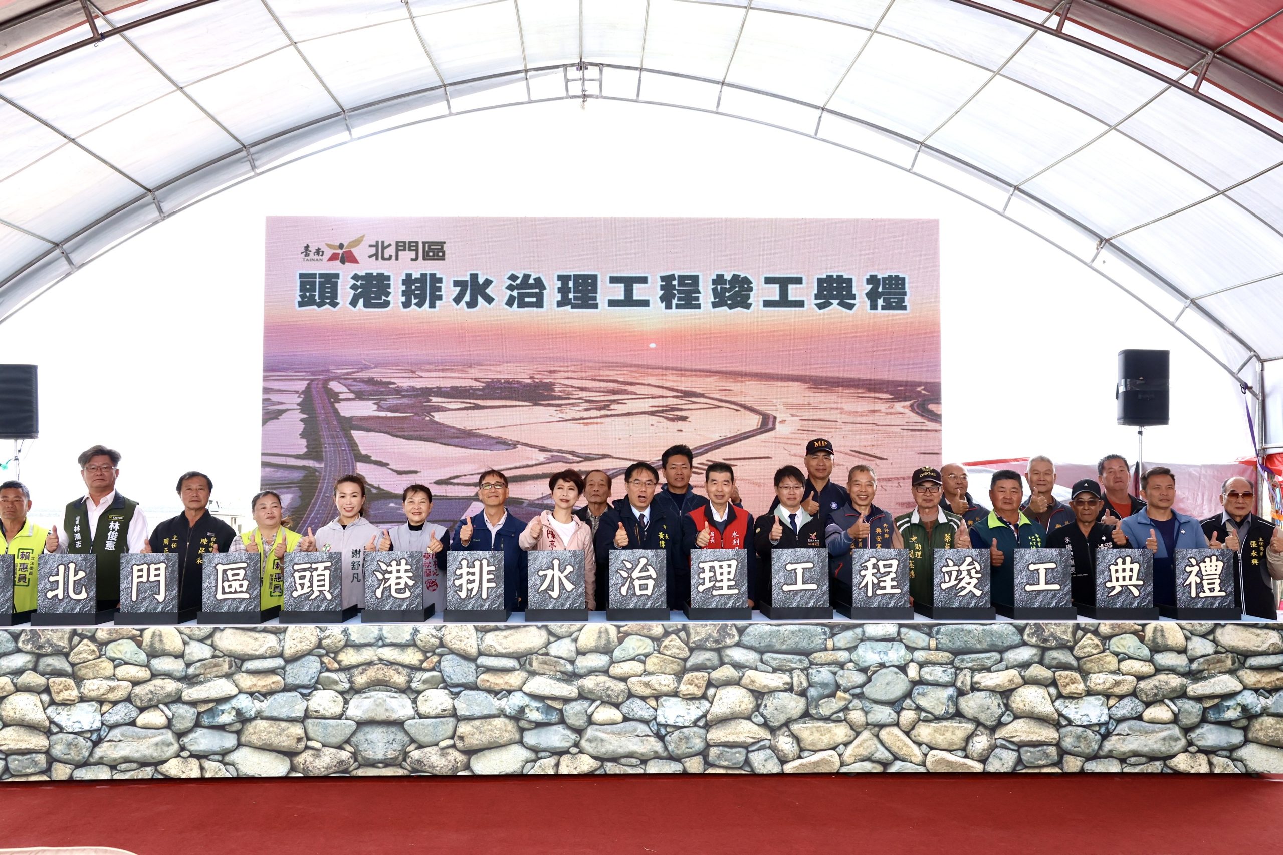 為強化北門區沿海暴潮及颱風豪雨防洪能力,市府向水利署爭取前瞻水安全計畫七千萬元補助,辦理「北門區頭港排水治理工程」,二十六日舉行竣工典禮。市長黃偉哲表示,工程以護岸背填培厚及生態友善工法,除大幅提升排水護岸安全性,並兼顧低碳與生態保育。