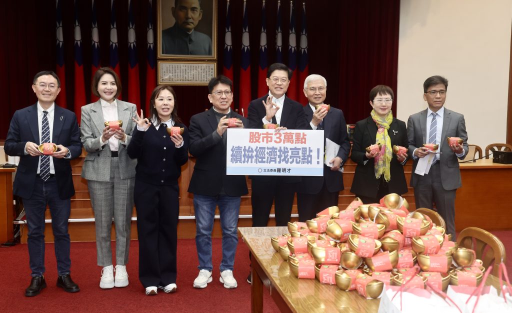 台北股市26日續創新高,國民黨立委羅明才(右4)在立法院財委會請吃雞排、喝珍奶,並與央行總裁楊金龍(右3)、財政部長莊翠雲(右2)、金管會主委彭金隆(右)等人手持金元寶合影。(中央社)