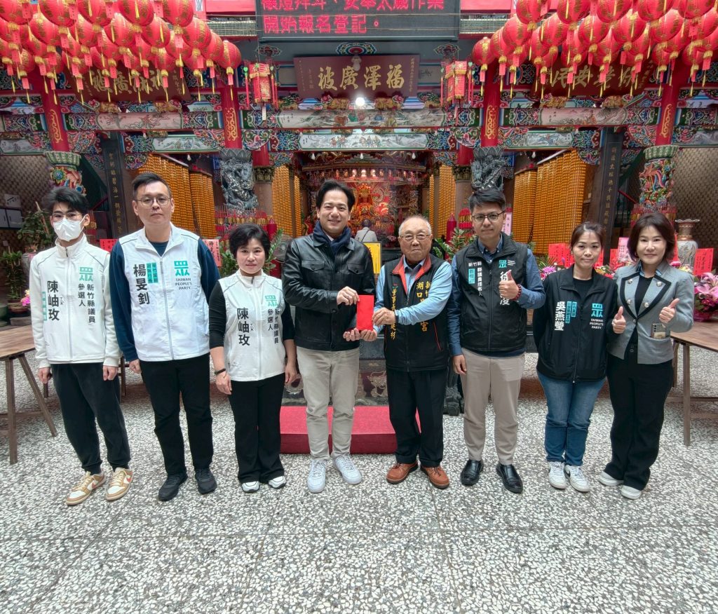 為展現深耕地方、服務鄉親的決心,台灣民眾黨新竹縣黨部主委、也是新竹市副市長邱臣遠率領湖口鄉提名參選人陳岫玫與新豐鄉提名參選人徐勝凌,前往湖口鄉信仰中心「顯聖宮」參拜,並拜會顯聖宮董事長黃廷杉,針對地方基層建設、廟宇文化傳承及民生議題進行深入交流。