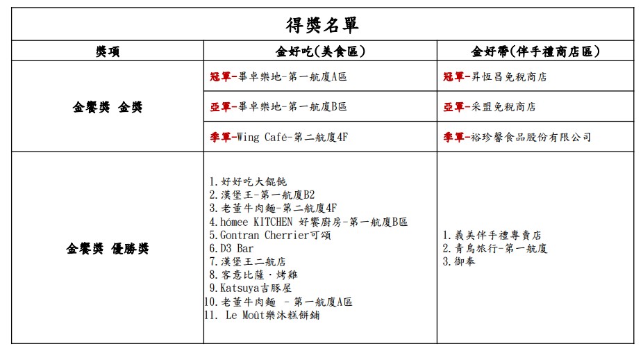 機場公司舉行「2025桃園國際機場美食嘉年華頒獎典禮」,揭曉最受旅客青睞的機場餐飲與伴手禮品牌,並頒發象徵桃園機場美食最高榮耀的「金饗獎」。本屆活動共有84家餐廳及伴手禮品牌參與,透過Google Maps公開透明的評價機制,活動期間累積旅客評論數突破2萬則,讓旅客以實際行動支持心目中的美味首選,選出「金好吃」餐廳及「金好帶」伴手禮,展現桃園機場餐飲與服務的整體實力。