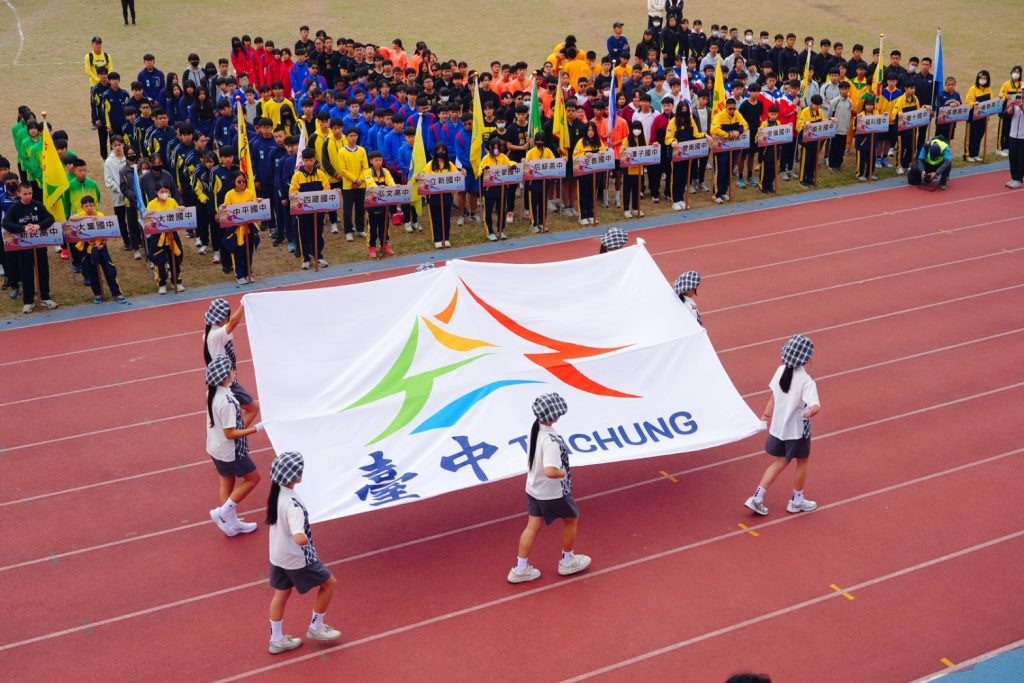 教育局指出,開幕典禮在潭秀國中旗手高舉台中市旗進場時掀起最高潮,展現選手們團結一致、昂揚向前的精神。