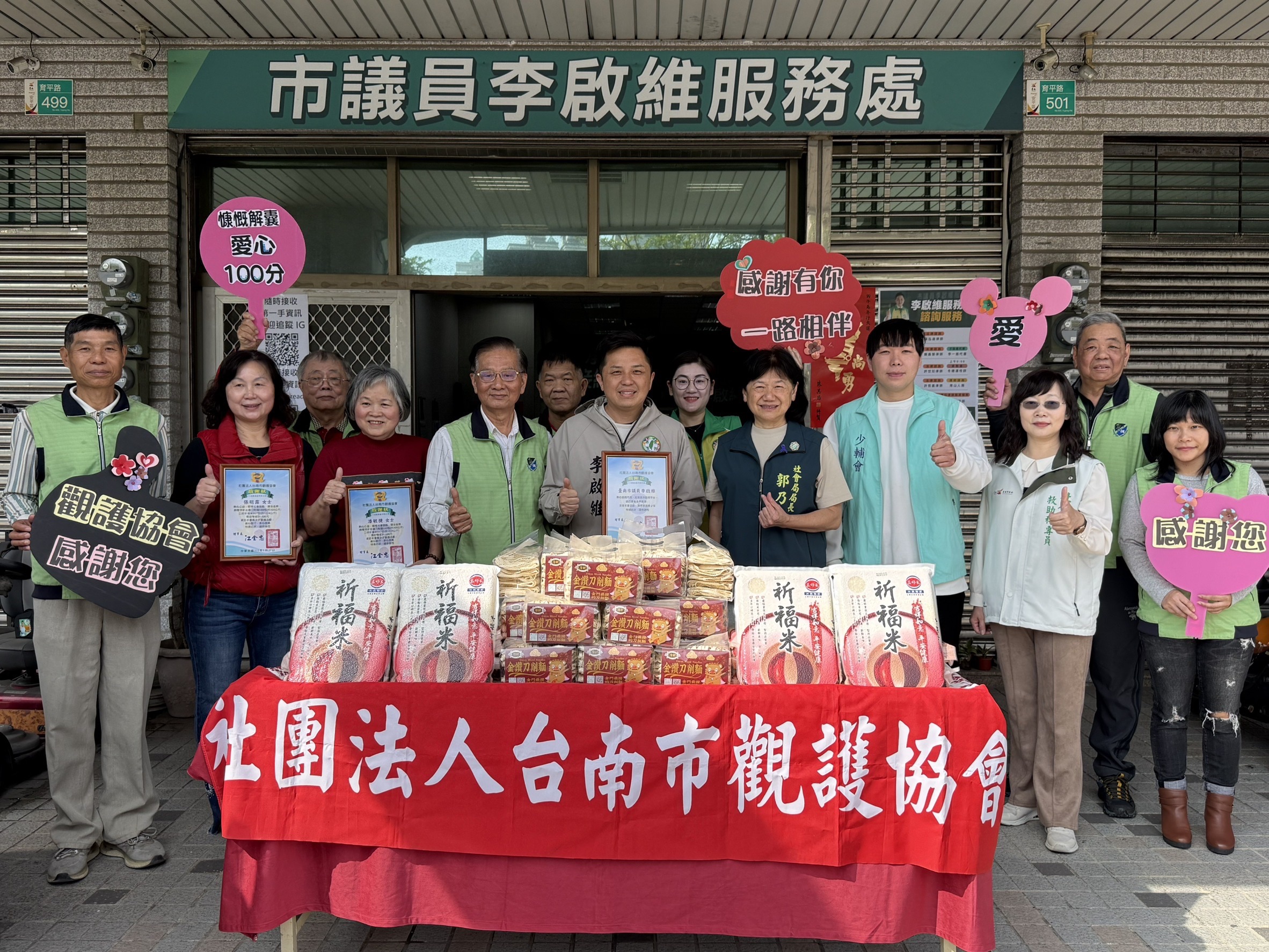 農曆春節將屆,關懷弱勢非行少年及其家庭,議員李啟維邀請各界善心人士及熱心企業,二十七日共同捐助上千公斤米麵及九萬餘元給台南市觀護協會,由理事長江金忠代表接受,社會局長郭乃文也到場鼓勵。
