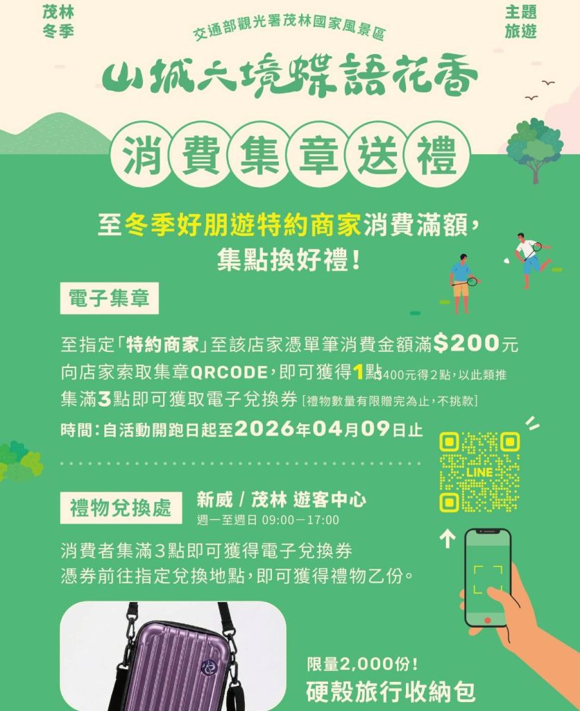 交通部觀光署茂林國家風景區管理處攜手在地旅宿與觀光產業,共同推出「冬季主題旅遊推廣活動」,以「留宿贈獎」、「留宿抽獎」、「特約商家消費集章贈禮」三重好康,邀請遊客平日到茂林、六龜(寶來、不老溫泉區)及周邊山城聚落,體驗溫泉療癒、自然生態與部落文化,帶動區域觀光消費。