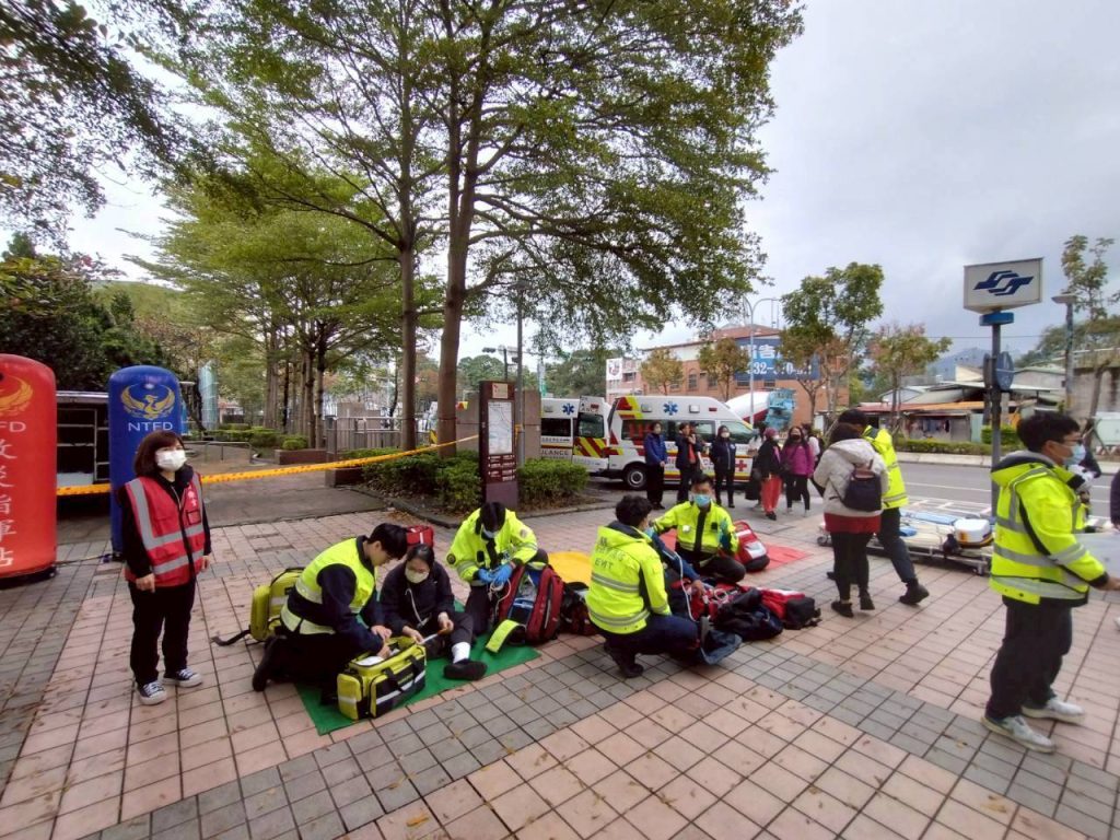 消防局第五大隊提到,救護處置演習部分,啟動大量傷病患(MCI)機制,縮短黃金救治時間,針對模擬情境中的受傷民眾,消防局於土城站1號出口迅速成立大量傷病患處置站。現場救護人員依據START 檢傷分類原則,將傷患依傷勢分級進行初步救治與資訊彙整,並由幕僚人員精確紀錄傷情。隨後,傷患依序後送至土城長庚醫院,全面驗證大傷流程從現場檢傷、急救到醫院轉運的無縫銜接。