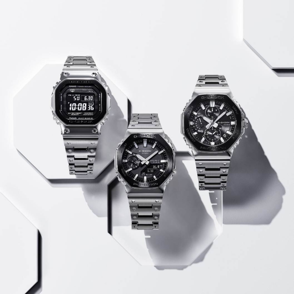 本次全新的外觀設計以黑色 IP 處理錶圈為視覺核心,其與銀色錶身以及GM-B2100BT-1A與GMC-B2100BT-1A的銀色蒸鍍時標形成鮮明對比,象徵 G-SHOCK 堅韌不屈的精神,打造出能輕鬆駕馭多元風格的亮眼配件。為了凸顯金屬腕錶細膩質感,全新錶款的錶殼斜角邊緣則施以鏡面拋光,使金屬光澤更顯立體,GM-B2100BT-1A與GMC-B2100BT-1A的錶圈表面更增添髮絲紋處理呈現層次感的同時添加優雅質感。全新腕錶皆由日本山形廠Yamagata Casio 精心製造,為以全金屬樣貌實現 G-SHOCK 原創耐震結構,在錶圈與錶殼之間嵌入高耐衝擊的精密樹脂避震材質,並結合三叉錶耳結構與金屬錶帶設計,能有效分散連接套筒與按鈕軸所承受的衝擊力,同時也能兼顧卓越的耐用性與配戴舒適度,旋入式背蓋結構也進一步強化密封性與整體耐久表現。在不鏽鋼金屬加工上,錶帶特別以打凹工法致敬初代 G-SHOCK 樹脂錶帶的經典輪廓,而錶圈與錶殼則歷經鍛造、切割與拋光等多道細緻工序,精準勾勒出堅固有力的造型線條,充分展現 G-SHOCK 對細節與工藝的極致堅持。