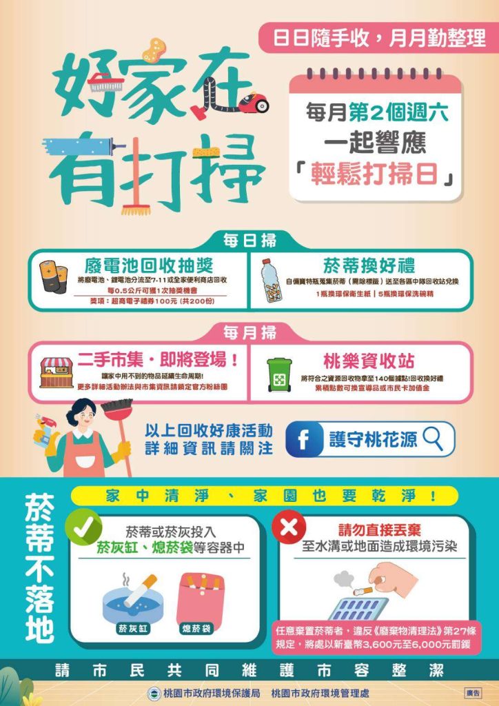 為改善春節前夕垃圾量暴增、清潔人力高度集中的問題,桃園市環境管理處推出「好家在,有打掃」居家清理新模式,將傳統一年一次的年終大掃除,轉型為「日日隨手收、月月勤整理」的常態清潔行動,結合每日、每月資源回收兌換機制,引導市民逐步完成居家整理,同時落實斷捨離與循環利用理念。