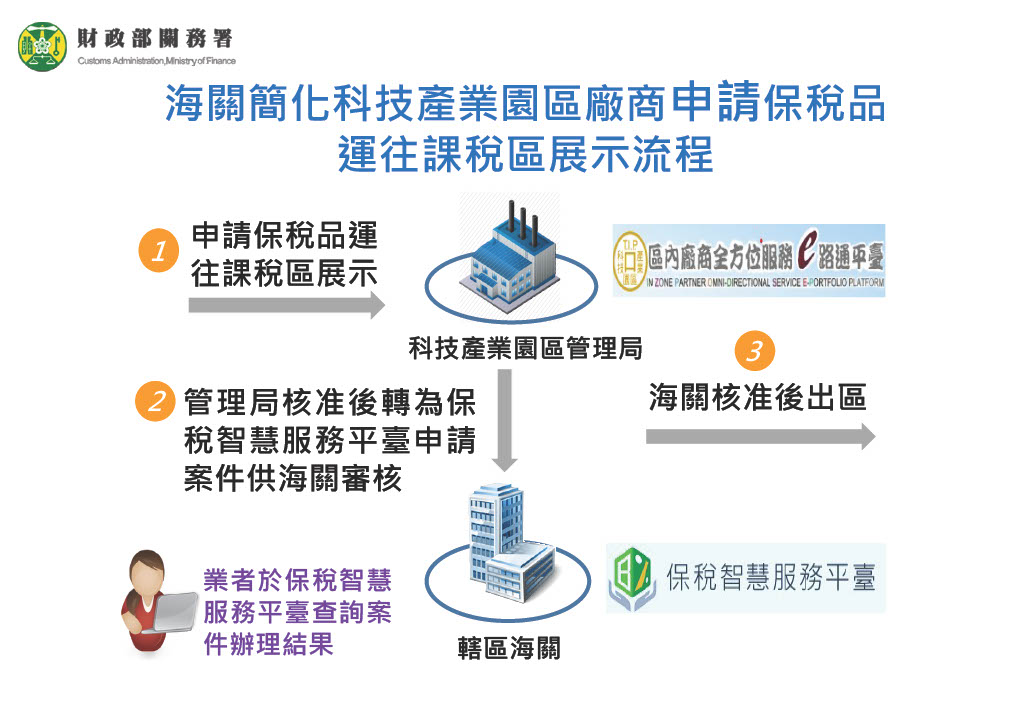 關務署進一步說明,過去區內事業申請保稅品運往課稅區展示時,區內事業須於「科技產業園區e路通平臺」向管理局申辦核准後,再於海關「保稅智慧服務平臺」線上填具出區展示申請書,並經轄管海關核准後始得出區。為簡化業者須分別向不同行政機關申請之作業,已完成經濟部「科技產業園區e路通平臺」與海關「保稅智慧服務平臺」資料介接,區內事業僅須於「科技產業園區e路通平臺」填報1份申請資料,經管理局核准後,海關即可於「保稅智慧服務平臺」審核該申請案件,簡政便民並提升效率。