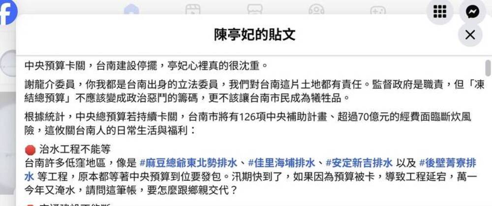 中央總預算卡關,陳亭妃二十八日在臉書發文,點名謝龍介,指出「凍結中央總預算不該成為政治惡鬥的籌碼,更不該讓台南市民成為犧牲品」,強調預算若持續卡關,恐讓台南多項重大建設與民生計畫全面停擺。截至發稿為止,謝龍介沒有發表回應。