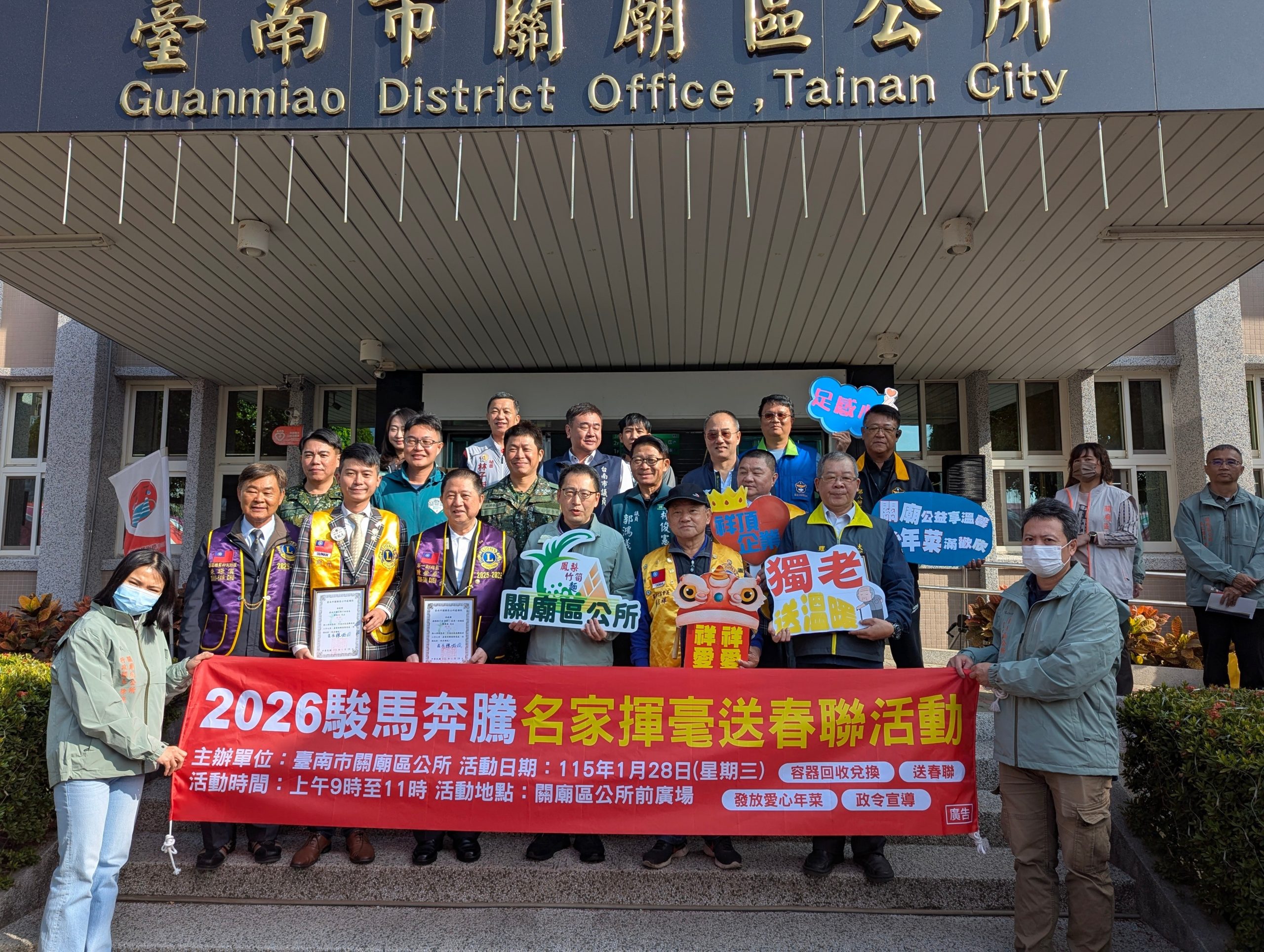 迎接農曆馬年到來,關廟區公所二十八日舉辦「二0二六駿馬奔騰─名家揮毫送春聯」活動,邀請在地鄉親在濃厚的墨香中,共同感受傳統年節文化。關廟區長陳必成表示,在墨香與溫情環繞下,現場亦整合了多項便民服務與政策宣導以提升居民生活福祉。