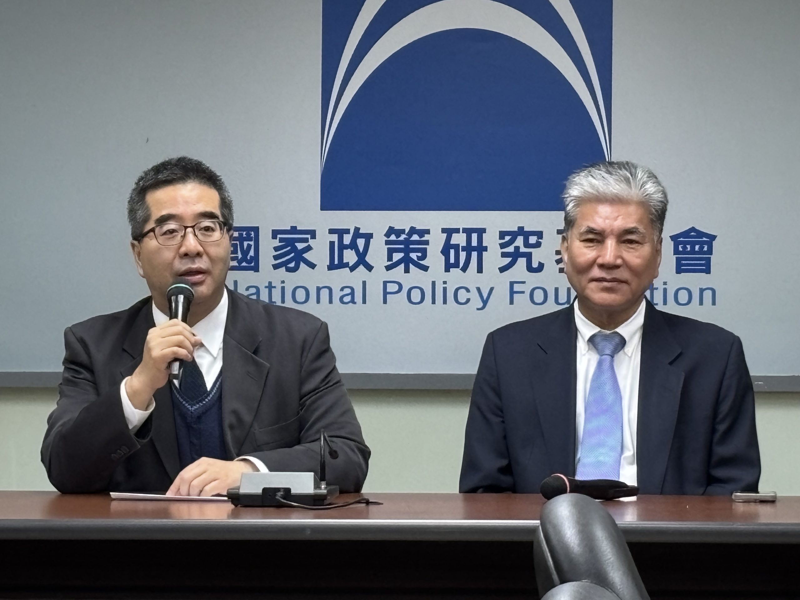 蕭旭岑和李鴻源在國民黨智庫召開記者會。蕭旭岑表示,此次論壇將聚焦三大主題包括觀光旅遊交流、產業交流合作、環境永續發展,共同探討包括旅遊、航點、醫療安養、精密機械、AI人工智能、防災減災、新能源、環保節能減碳等重要面向。