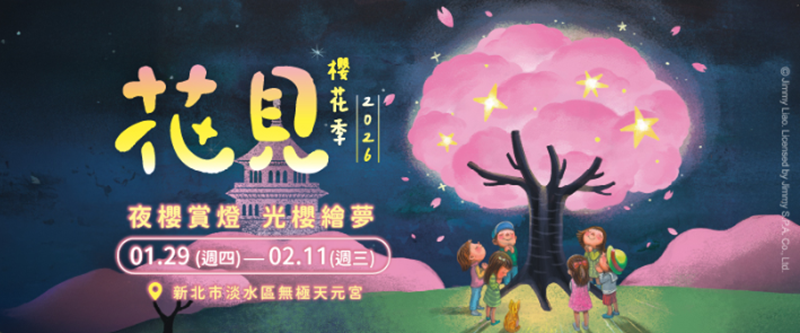 2026花見櫻花季將於今(29)日起至2月11日在淡水區北新路無極天元宮展出!今年除了可欣賞盛開的三色櫻外,還新增了由淡水學堂策劃的「櫻花慢旅」走讀、與在地商家合作,提供阿給及各式手作活動折價優惠,以及結合藝術家幾米所創作的《閉上眼睛一下下》之繪本世界,打造互動場景等活動,美景搭配燈光,濃濃的粉色櫻花風格,預計可吸引大量遊客前來觀賞。